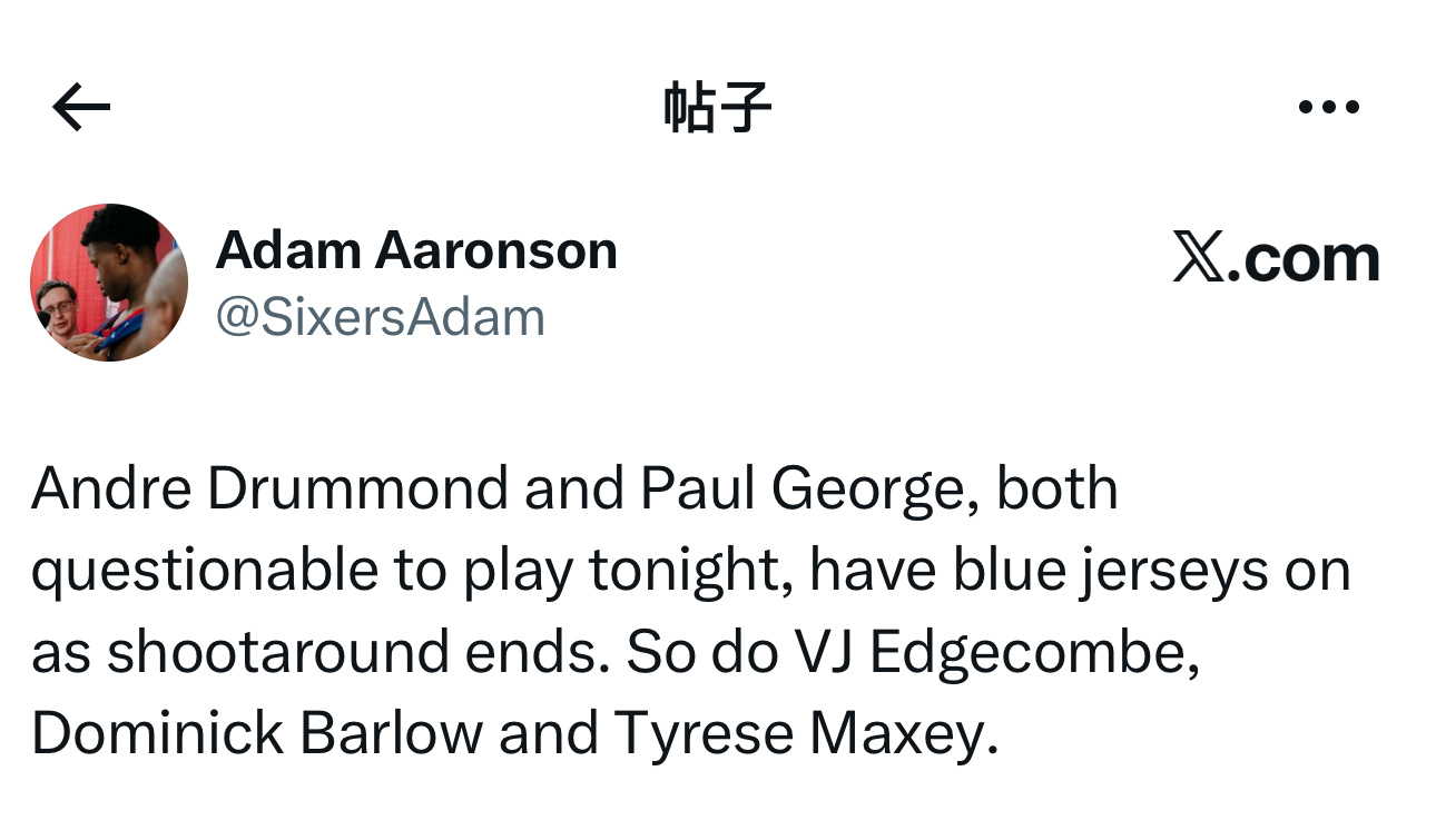 随队记者Adam Aaronson表示,“明日主场对阵奇才队的比赛,安德烈·德拉蒙德和保罗·乔治仍被列为出战成疑,但在刚结束的球队集训后两人身穿蓝色训练服。一同穿着蓝色训练服的还有VJ·埃奇库姆、多米尼克·巴洛和泰雷斯·马克西。”费城76人新赛季篮不住PaulGeorge保罗乔治