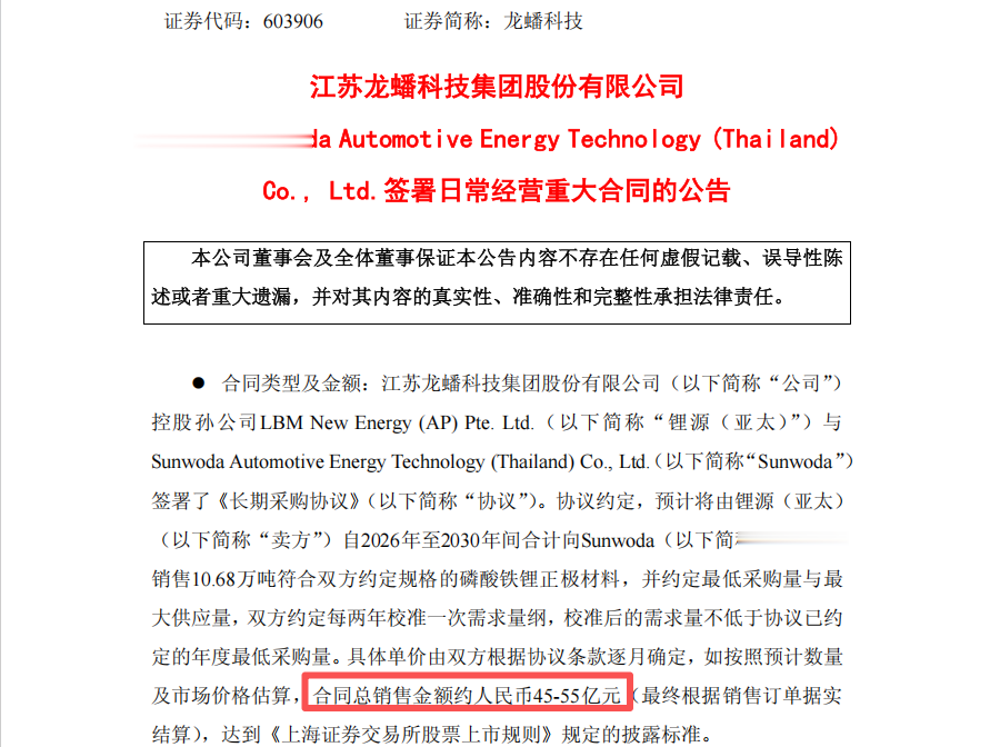 12月2日晚间,龙蟠科技发布公告称,公司控股孙公司LBMNewEnergy(AP)Pte.Ltd.(以下简称锂源亚太)签订《长期采购协议》,预计销售金额为45亿元至55亿元。