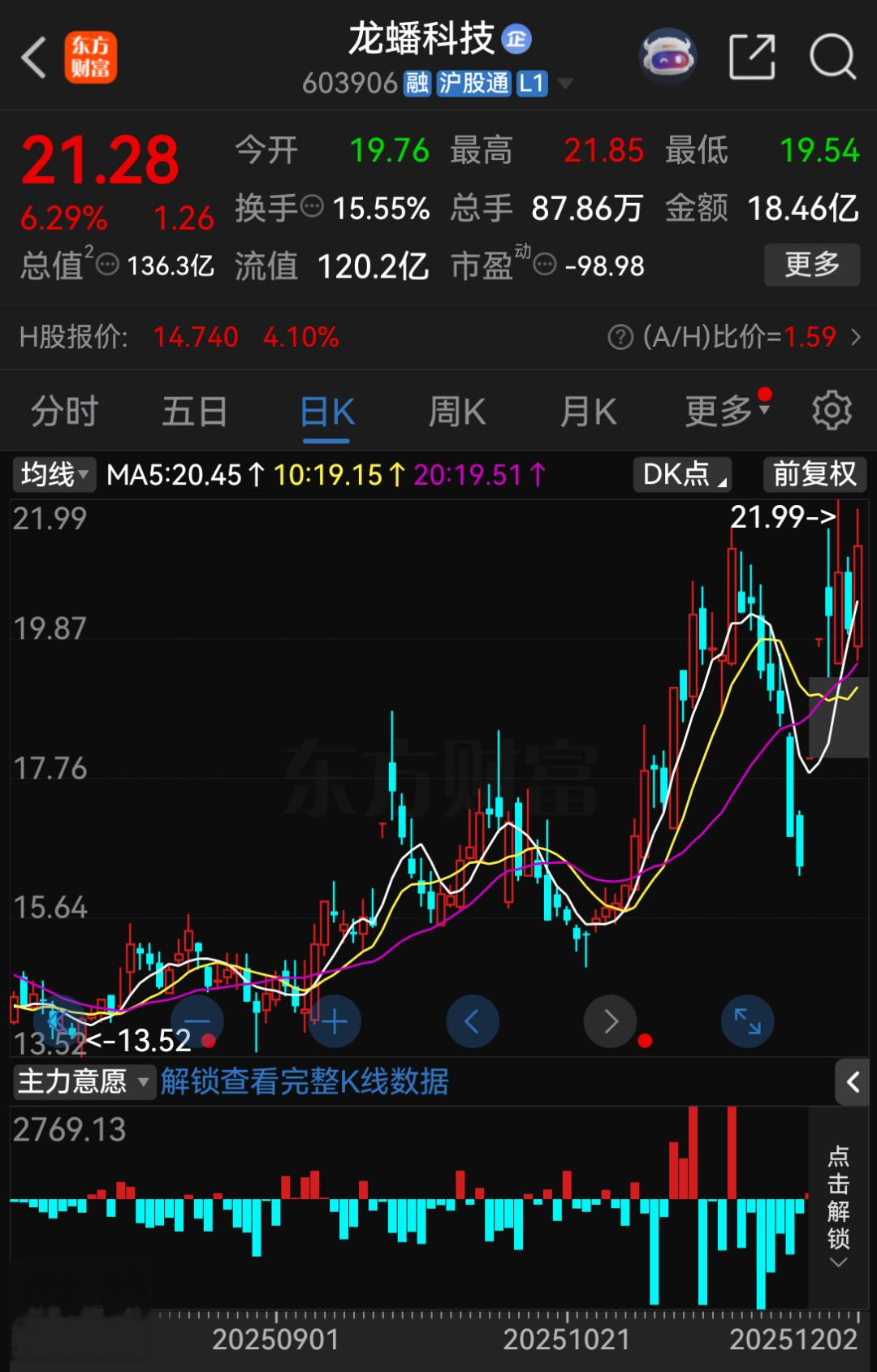 截至12月2日收盘,龙蟠科技股价报21.28元/股,涨幅达6.29%,总市值为136.3亿元。