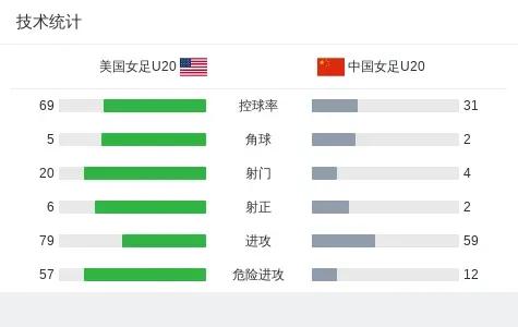 中国U20女足0比1美国U20女足,美国女足完全掌控场上局面,中国女足只能反守反击,美国女足身体对抗占优,控球率69%,中国女足只能疲于防守,基本打不出什么像样进攻,全场仅有4次射门,美国女足狂攻20次射门,上半场29分钟打进1球,下半场浪费了几次机会,中国女足防线还算稳定,最终,美国U20女足1比0中国U20女足,中国女足对欧美球队身体还是吃亏,以后必须储备加强体能对抗,中国U20女足加油!