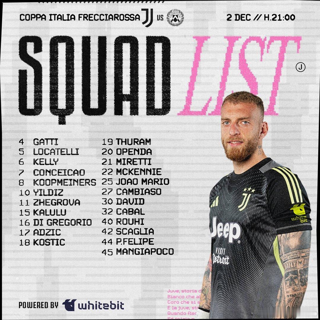 你妇公布了和乌迪内斯的比赛大名单,佩林、弗拉霍维奇、布雷默、米利克、平索里奥和鲁加尼因伤缺阵。尤文图斯意大利杯尤文图斯vs乌迪内斯