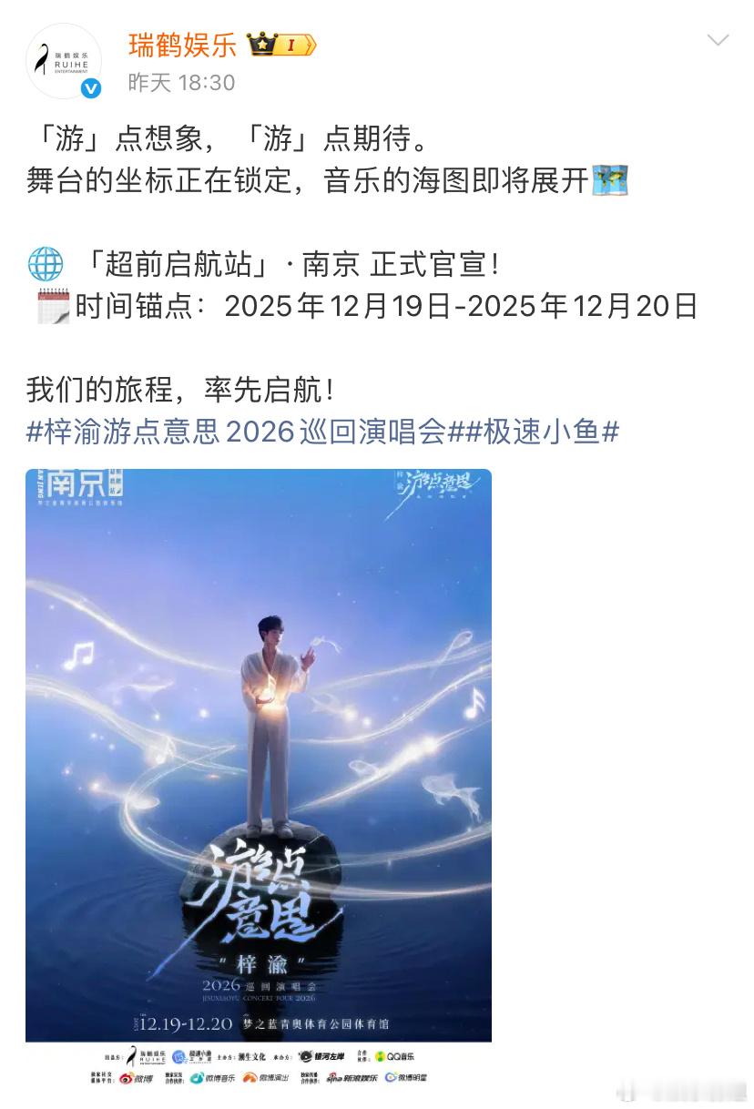 梓渝音乐的海图即将展开梓渝游点意思2026巡回演唱会 官宣了南京站,武汉站,厦门站,新的海图已经绘就,期待与你,继续破浪前行!