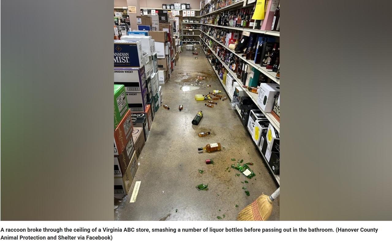 美国一只浣熊闯入酒类商店打破酒瓶喝醉,被警方拘留 黑色星期五,美国弗吉尼亚一只浣熊通过天花板闯入一家酒类商店后,砸碎了多瓶酒,随后醉倒在商店卫生间,警方根据现场一串破碎的酒瓶痕迹找到它将其拘留。 警方将这只醉酒的浣熊带到动物收容所清醒。 警方在声明中写道:“睡了几个小时,除了可能宿醉和糟糕的生活选择外,没有任何受伤迹象,他被安全放回野外,希望他已经明白闯入并不是解决办法。” 没有该事件的录像,浣熊是从天花板进入建筑物,“把摄像头也破坏了”。
