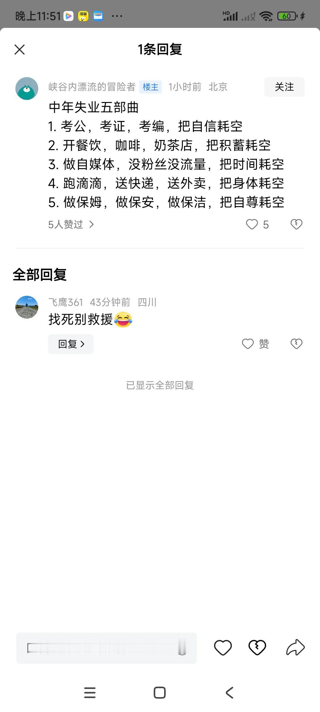 这个网友说的实在,发人深思,,现在干啥都难,挣钱太难了,,, 一,考公,考编,僧多粥少,大多数淘汰出局, 二,自己创业,什么奶茶店,餐饮店,把积蓄耗空, 三,做自媒体,没粉丝,流量,耗时间。有时候一天收入几毛钱,,[捂脸][捂脸] 四,跑滴滴,送外卖,把身体耗空,朋友开滴滴一天十几个小时,腰酸背痛,,, 五,做保姆,保洁,业主呼来唤去,自尊耗空, 不知道干啥好了,,,最好有个几亩地,自由自在,现在种地机械化也不累了,,,