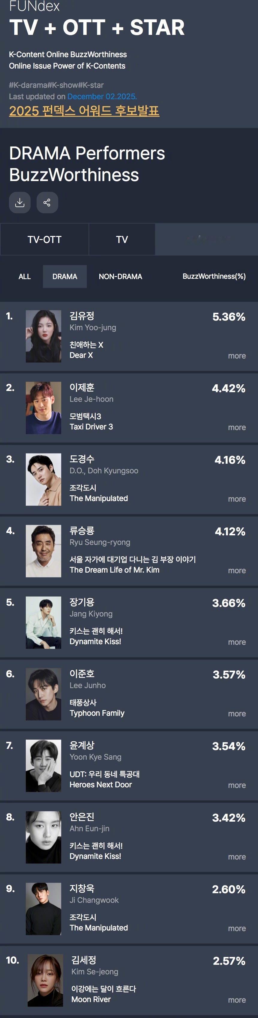 GOODDATA公布2025年11月第4周电视剧出演者话题性排行。1.金裕贞 亲爱的X 5.36%2.李帝勋 模范出租车3 4.42%3.都暻秀 操控游戏 4.16%4.柳承龙 金部长的梦想人生5.张基龙 一吻爆炸6.李俊昊 台风商社7.尹启相 UDT:我们小区特工队 8.演员安恩眞 一吻爆炸9.池昌旭 操控游戏10.金世正 月亮在江边流淌