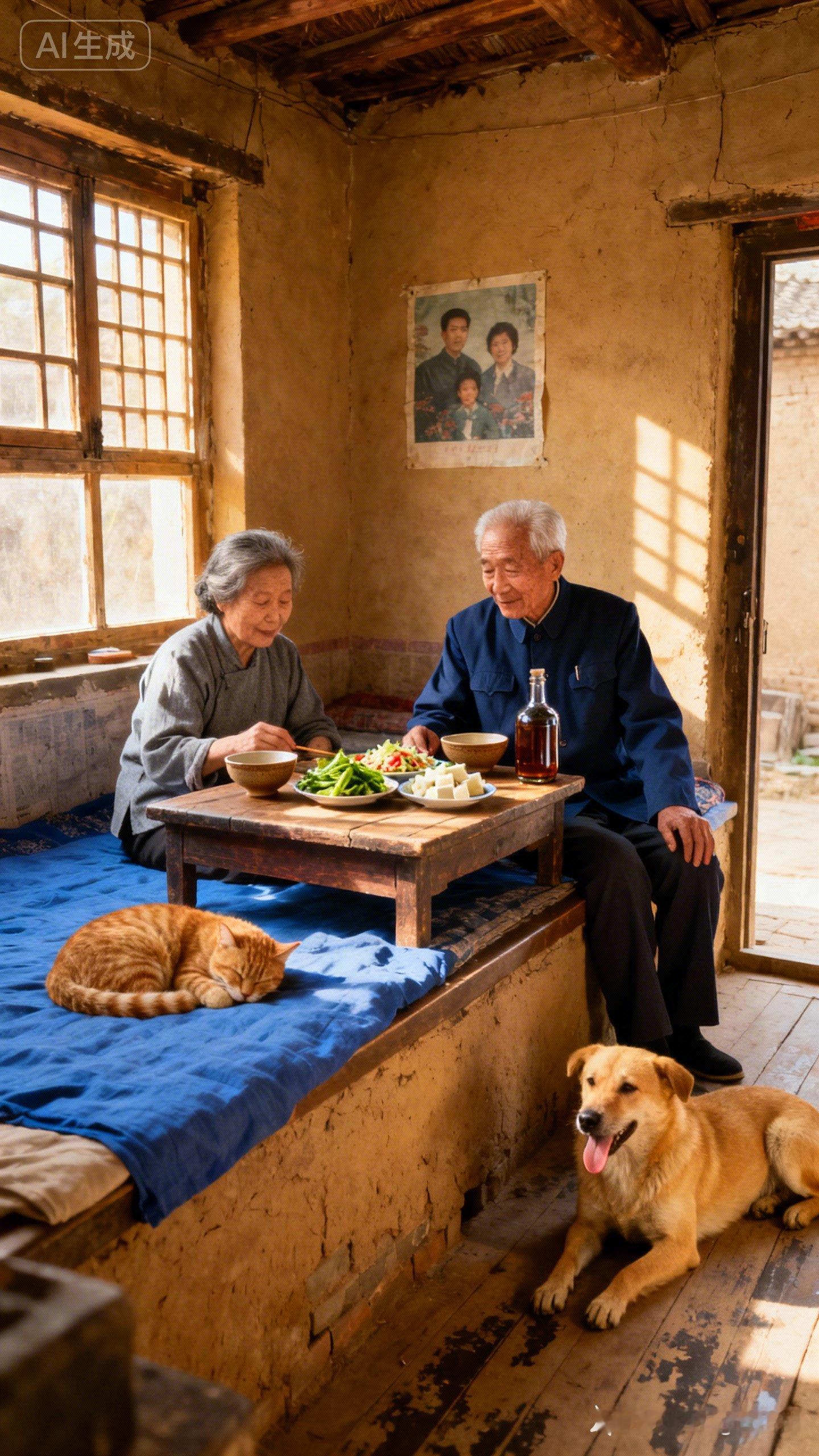 温馨的乡村生活,老夫妻与宠物共度美好时光。