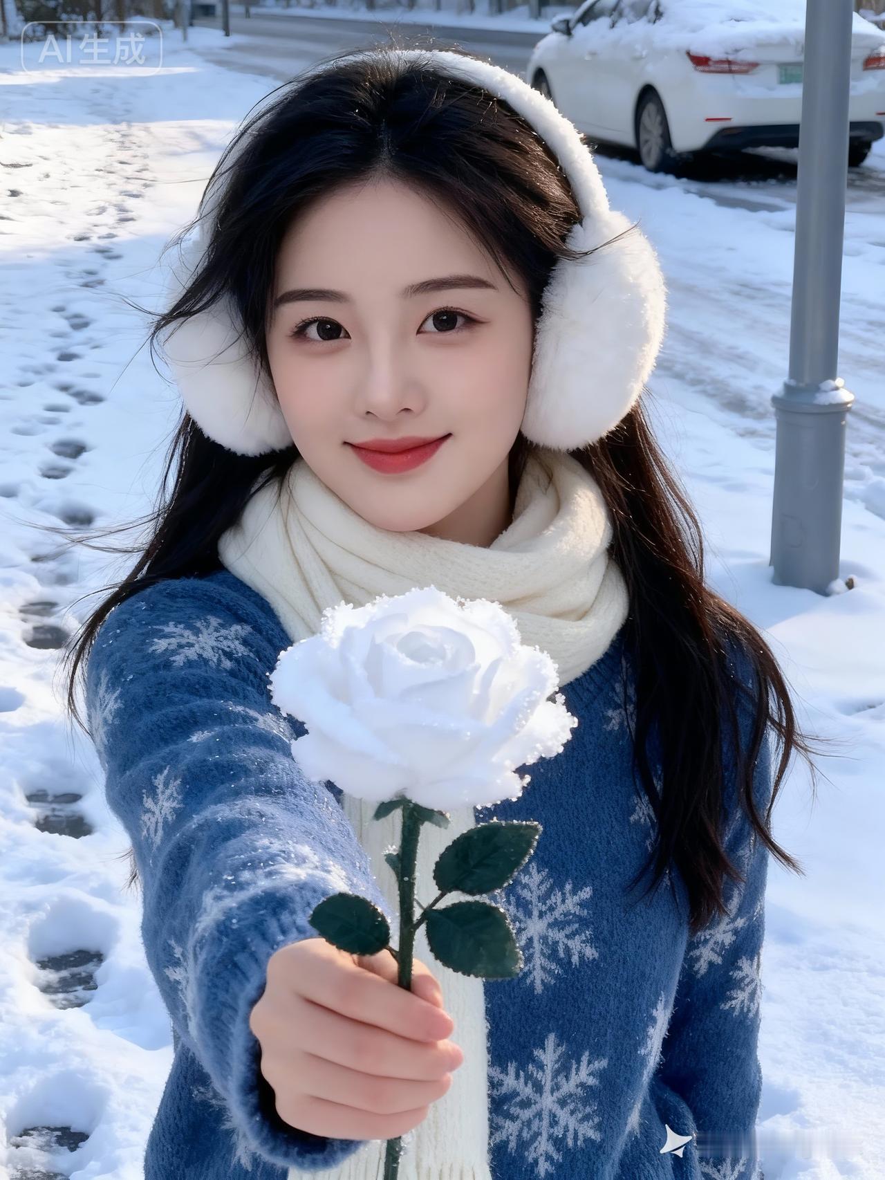 冬日暖阳下,手捧白玫瑰,雪地漫步的美好时光。