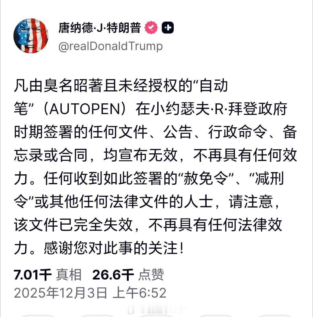 特朗普宣布拜登时期文件全部作废特朗普宣布,拜登执政时期的所有文件、公告、行政命令、备忘录及合同均无效。