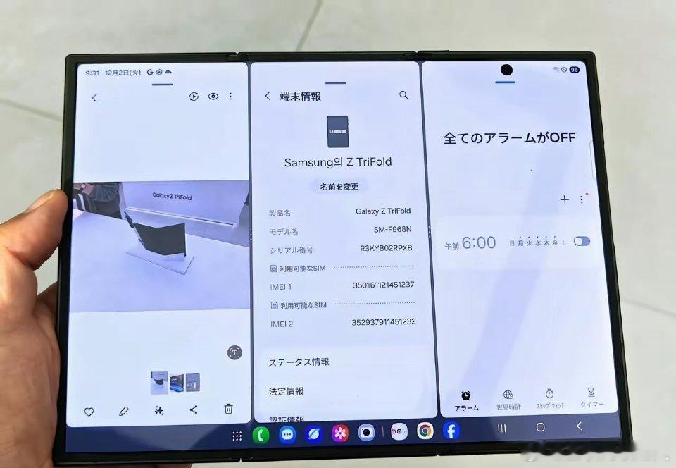 陈震: 三星三折叠来了!就在刚才,陈震在社交网络晒出了三星一款三折叠手机的形态。先看颜色,走的是克制路线——没有大红大绿甚至金黄色这类跳脱色调,而是采用非常中性的设计,整体是浅灰色调,再点缀些许纹路,质感很显高级。与华为的三折叠区别还是蛮大的,差异挺明显。三星这款拿在手上,上下左右都能清晰看到黑色外边框与亮屏的边界,整体造型方方正正,透着稳重感,和之前三星系列手机的风格完全一致,一眼就能认出家族化设计语言,一脉相承的味道很足。目前这款手机在咱们这边的具体价格还没公布,这会儿可以从外观、配置、颜色这些大方向看看,三星的三折叠和华为到底有哪些不同。