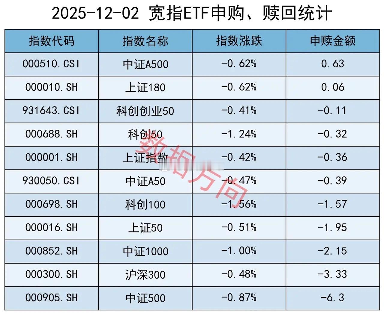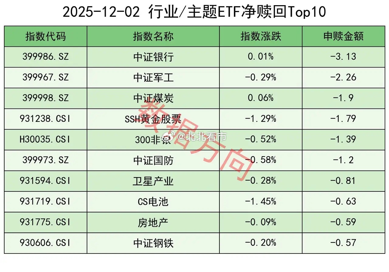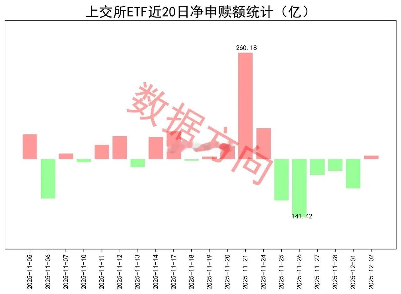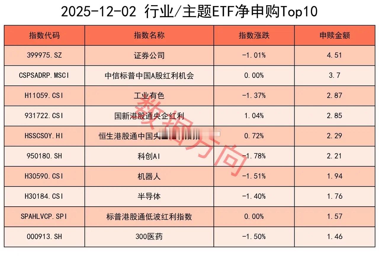ETF结束5连赎12月2日星期二,大盘缩量调整,仅有福建、煤炭等少数概念和行业上涨。上证指数跌幅0.42%,再次跌破3900点大关,上交所ETF合计净申购 8.88亿元,结束了连续5天净赎回。近段时间,期指的数据越来越好,但ETF的数据一直没有跟上。宽指中证A500指数(0.63亿)、上证180指数(0.06亿),分别获小幅净申购。中证500指数(-6.3亿),净赎回超过5亿。沪深300指数(-3.33亿)、中证1000指数(-2.15亿)、上证50指数(-1.95亿)、科创100指数(-1.57亿)、中证A50指数(-0.39亿)、上证指数(-0.36亿)、科创50指数(-0.32亿)、科创创业50指数(-0.11亿),分别被小幅净赎回。行业和主题 证券公司指数(4.51亿),获最多净申购;300非银指数(-1.39亿),进入赎回榜。中信标普中国A股红利机会指数(3.7亿)、国新港股通央企红利指数(2.85亿)、恒生港股通中国央企红利指数(2.29亿)、标普港股通低波红利指数(1.57亿),四只红利指数一起进入申购榜。其他进入申购榜的还有:工业有色指数(2.87亿)、科创AI指数(2.21亿)、机器人指数(1.94亿)、半导体指数(1.76亿)、300医药指数(1.46亿)。中证银行指数(-3.13亿),净赎回最多。中证军工指数(-2.26亿)、中证国防指数(-1.2亿)、卫星产业指数(-0.81亿),一起进入赎回榜。中证煤炭指数(-1.9亿)、SSH黄金股票指数(-1.79亿)、中证钢铁指数(-0.57亿),一起进入赎回榜。其他进入赎回榜的还有:CS电池指数(-0.63亿)、房地产指数(-0.59亿)。