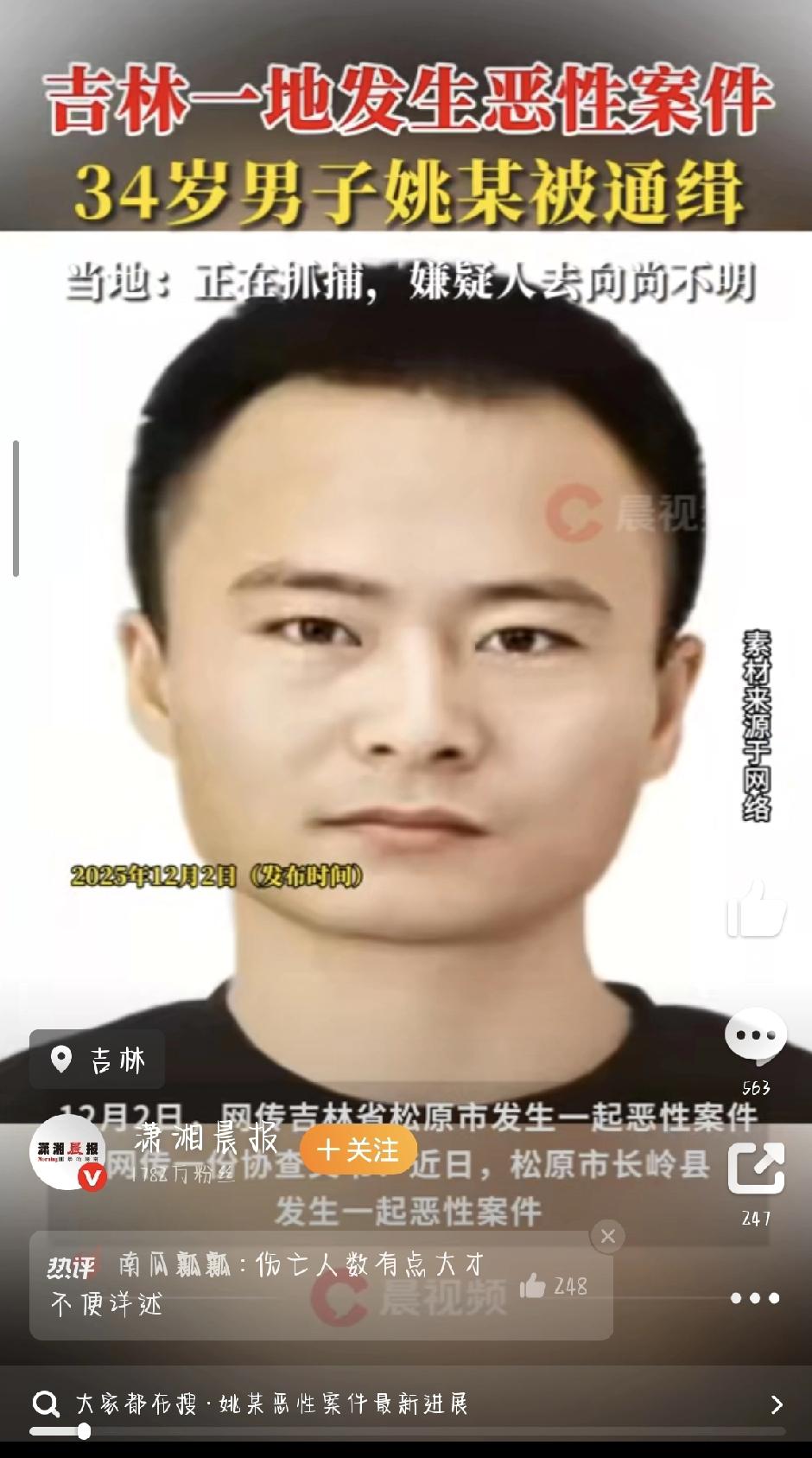 12月2日这天,吉林松原市长岭县发生的一起恶性案件在网上引发了不少人的关注,相关话题很快就成了大家讨论的热点。 最先传开的是一份网传的协查文书,上面写得明明白白,长岭县刚发生了一起恶性案件,经过警方侦查,34岁的男子姚某有重大作案嫌疑,还公布了他的身份证号220722199105063410。文书里把嫌疑人的特征描述得很详细,方便大家辨认:身高在165到170公分之间,中等身材,长着方圆脸,留着黑色中长发,皮肤偏黑。案发的时候,他穿的是一身黑,上身穿黑色衣服,下身穿黑色裤子,脚上蹬着运动鞋。文书还要求各单位赶紧开展排查工作,要是有相关线索,得第一时间上报到县局情指中心,下面还附上了通榆县公安局警官的联系方式和嫌疑人的照片。 这份协查文书一出来,就被网友们广泛转发,大家都很关心案件的具体情况,也好奇这起恶性案件到底是怎么发生的。为了弄清真相,潇湘晨报的记者当天晚上就行动了起来,先是拨打了协查文书上留的警官电话,想问问案情和案件进展。可没想到,民警表示不便透露这些信息,记者只好转而联系通榆县公安局,可工作人员却说没接过这起警情,对这件事完全不知情,还让记者关注警方官网发布的消息。 一边是流传的协查文书,一边是部分警方部门的不知情回应,这让大家心里的疑问更多了。直到12月2日晚上22时左右,事情才有了新的进展,记者从松原当地警方那里得到了确切消息:嫌疑人姚某目前还没被抓到,警方正在全力开展抓捕工作,但姚某的具体去向还不清楚。至于案件的更多细节,警方表示暂时不便透露,还得等后续的调查结果。 现在,这起案件还在进一步侦办中,大家最关心的就是警方能早日将嫌疑人姚某抓获归案,给受害者和家属一个交代。也有不少网友提醒,长岭县及周边地区的群众如果发现符合特征的可疑人员,一定要注意自身安全,不要轻易靠近,及时和警方取得联系提供线索。后续案件有什么新的进展,还是要以警方官方发布的通报为准,咱们也别随意猜测、传播未经证实的消息,共同为案件侦破营造良好的环境。 来源:潇湘晨报