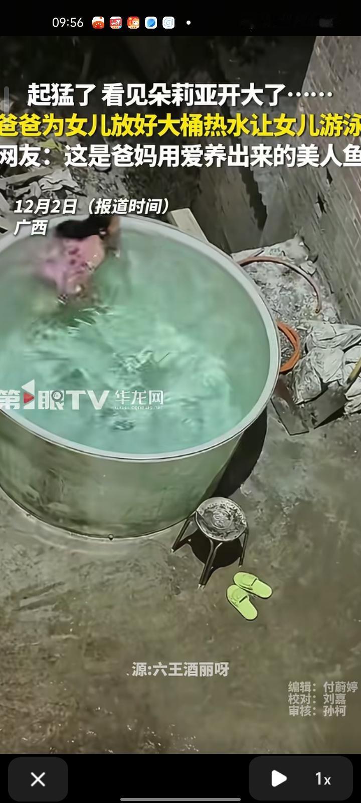 11月26日,玉林市容县。覃女士称,自家是酿酒的,每天有热水流出来,而女儿很喜欢玩水。孩子爸爸心想放出来也是浪费,灵机一动就买了大桶供孩子们游泳,到夏天一天能玩好几回。有网友调侃,这是爸妈用爱养出的美人鱼