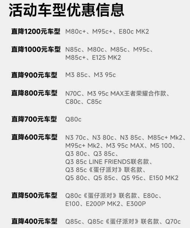 都到2025年12月了,大家期待中的九号新国标电动车还没来,却等来了一个“重磅消息”——九号旗下好多电动摩托车开始大幅降价了! 这次降价力度真不小,最高直降1200块!像M80c+、M95c+、E80cMK2这些热门车型都在列。除此之外,还有其他车型降1000、900、800……甚至最低也有400元的优惠,差不多是全系都在促销,这波诚意挺足啊! 为啥电动摩托车突然这么“香”了? 原来,新国标电动车虽然上市了,但标准变得更严,特别是防篡改设计让车子没法再轻松提速。这样一来,不少人都把目光投向了性能更强的电动摩托车——它的“春天”可能真要来了,估计这波降价也会带动不少销量。 附上这次九号电动摩托车的降价清单,快看看有没有你心仪的款吧: 直降1200元车型:M80c+、M95c+、E80cMK2 直降1000元车型 :N85c、M80c、M85c、M95c、M85c+、E125 MK2 直降900元车型:M3 85c、M3 95c 直降800元车型:N70C、M3 95c MAX王者荣耀合作款C80c、C85c 直降700元车型:Q80c 直降600元车型:N3 70c、N3 80c、N3 85c、M85c+ Mk2、M95c+ Mk2、M3 95c MAX、M5 100、Q3 85C LINE FRIENDS联名款、Q3 85c《蛋仔派对》联名款、Q5 80c、Q5 85c、Q5 95c、E150 MK2 直降500元车型:Q80c《蛋仔派对》联名款、E80c、E100、E200P MK2、E300P 直降400元车型:Q85c、Q85c《蛋仔派对》联名款、Q70c