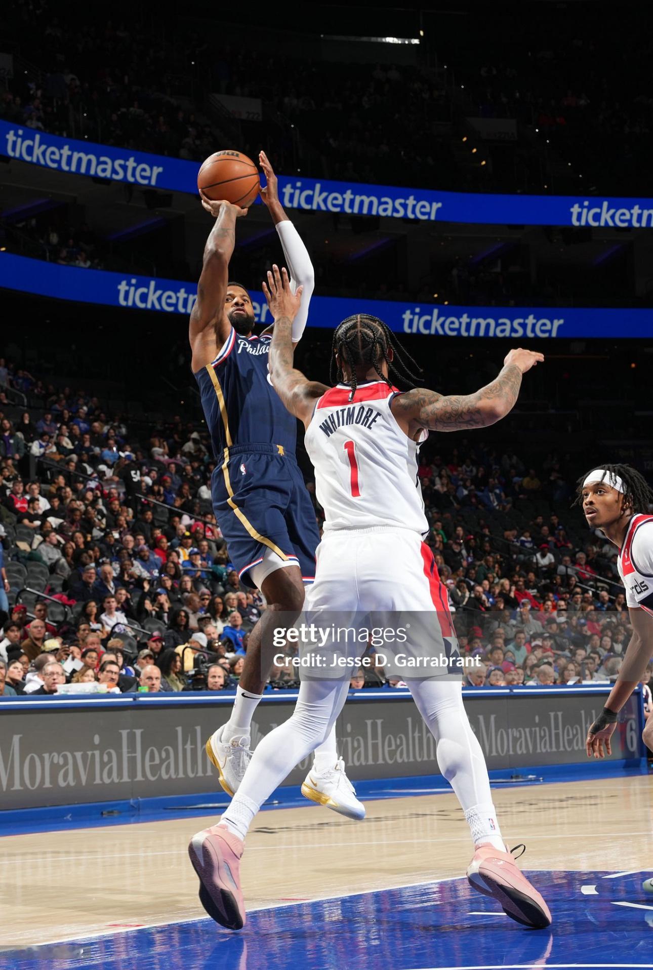 全场比赛结束:76人队主场121-102战胜奇才队!三节打卡!乔治今日仅上场不到18分钟,10投4中,三分5中3,得到11分5篮板1抢断,『2失误』,正负值+6!费城76人新赛季篮不住76人vs奇才