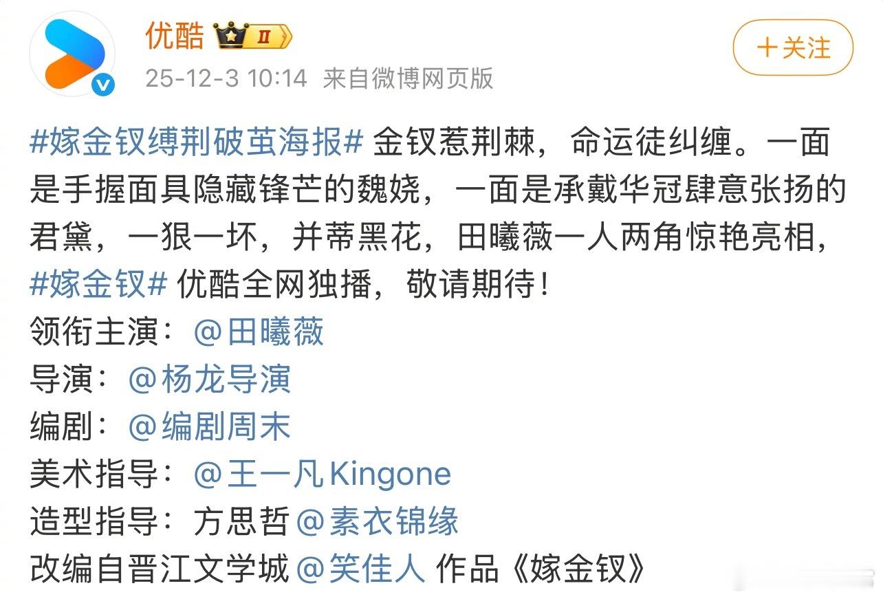 《嫁金钗》官宣一番大女主田曦薇 嫁金钗官宣了田曦薇