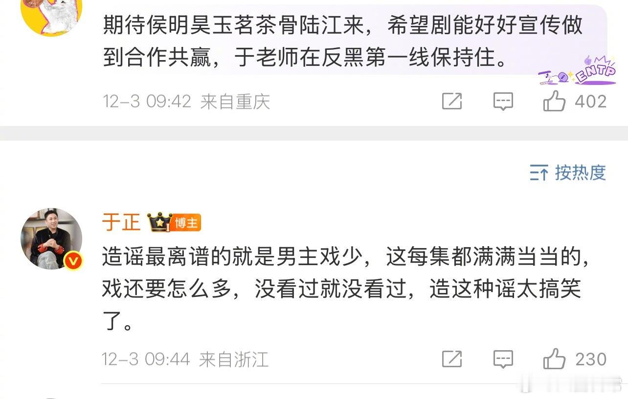 于正辟谣《玉茗茶骨》男主侯明昊戏份少,说每集都是满满当当的