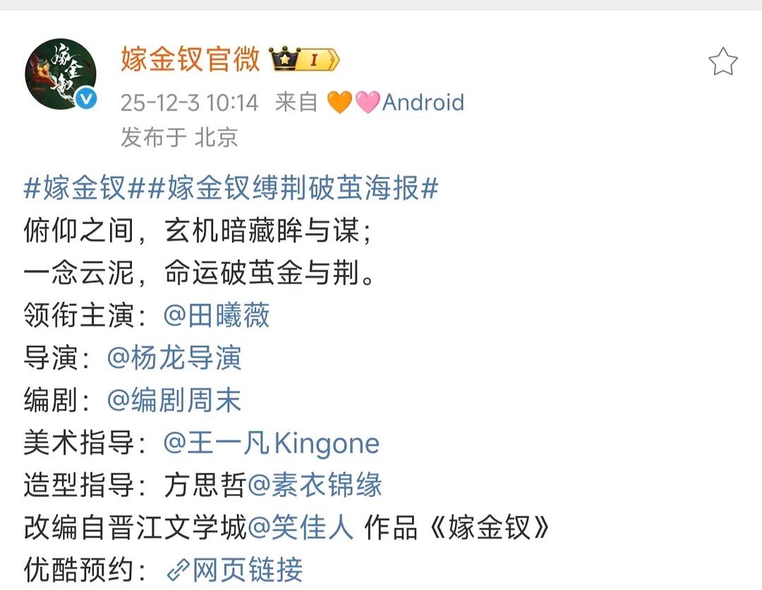 嫁金钗 嫁金钗就是传说中的大女主单宣吧,卡点田曦薇生日时间,小尾巴也是一番女主应援色,海报审美质感都很不错,编剧导演也都很强,也没有男女主抢番的戏码,这才是真正的单人过会,田曦薇伟大!嫁金钗官宣了田曦薇