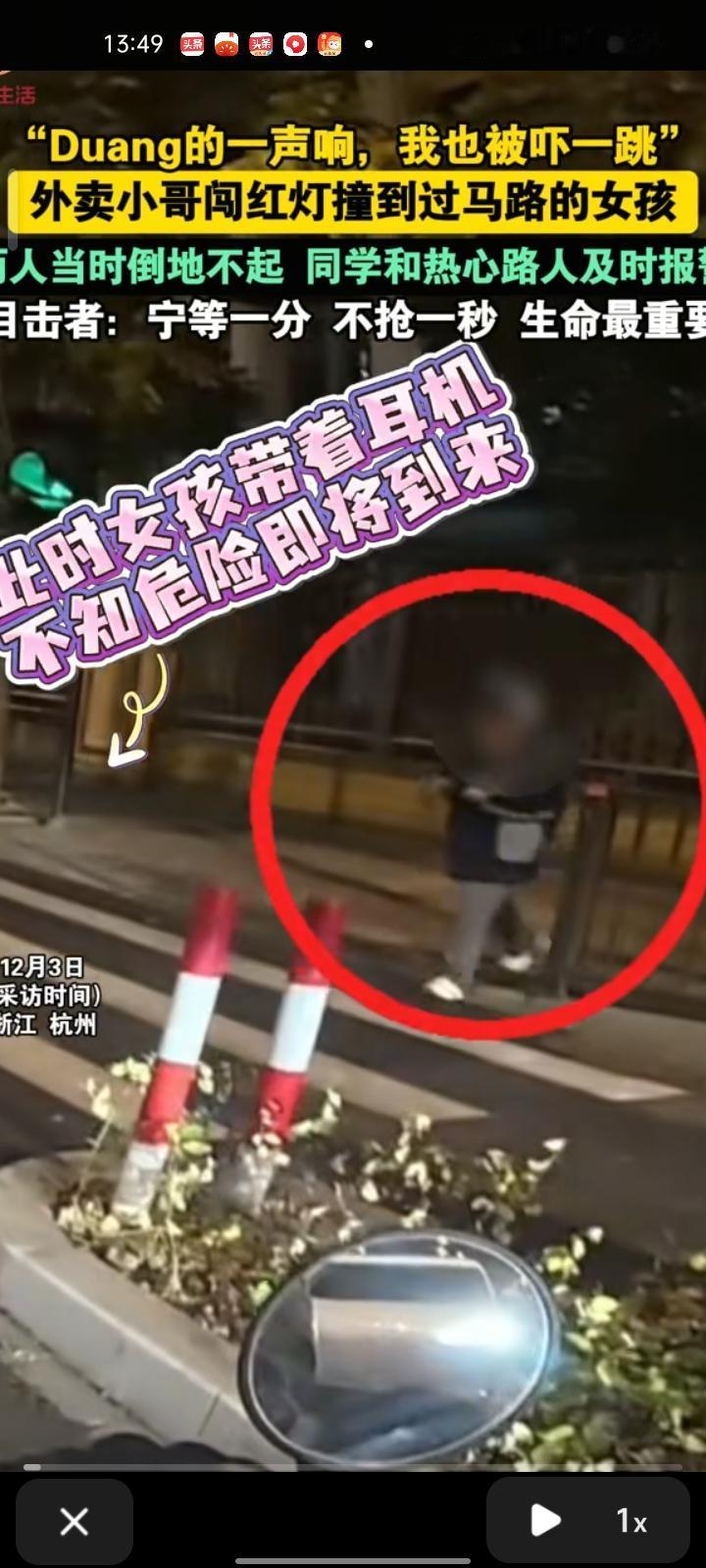 12月2日,浙江杭州。网友发视频表示,在T字路口等绿灯与外卖小哥同行,外卖小哥可能想要直接过去,把女孩撞到了,Duang一声响,女孩痛到说不出话,同学、路人及时拨打120,目前女孩被送往医院,其他的交给交警处理了。提醒大家,宁等一分不抢一秒,生命最重要。