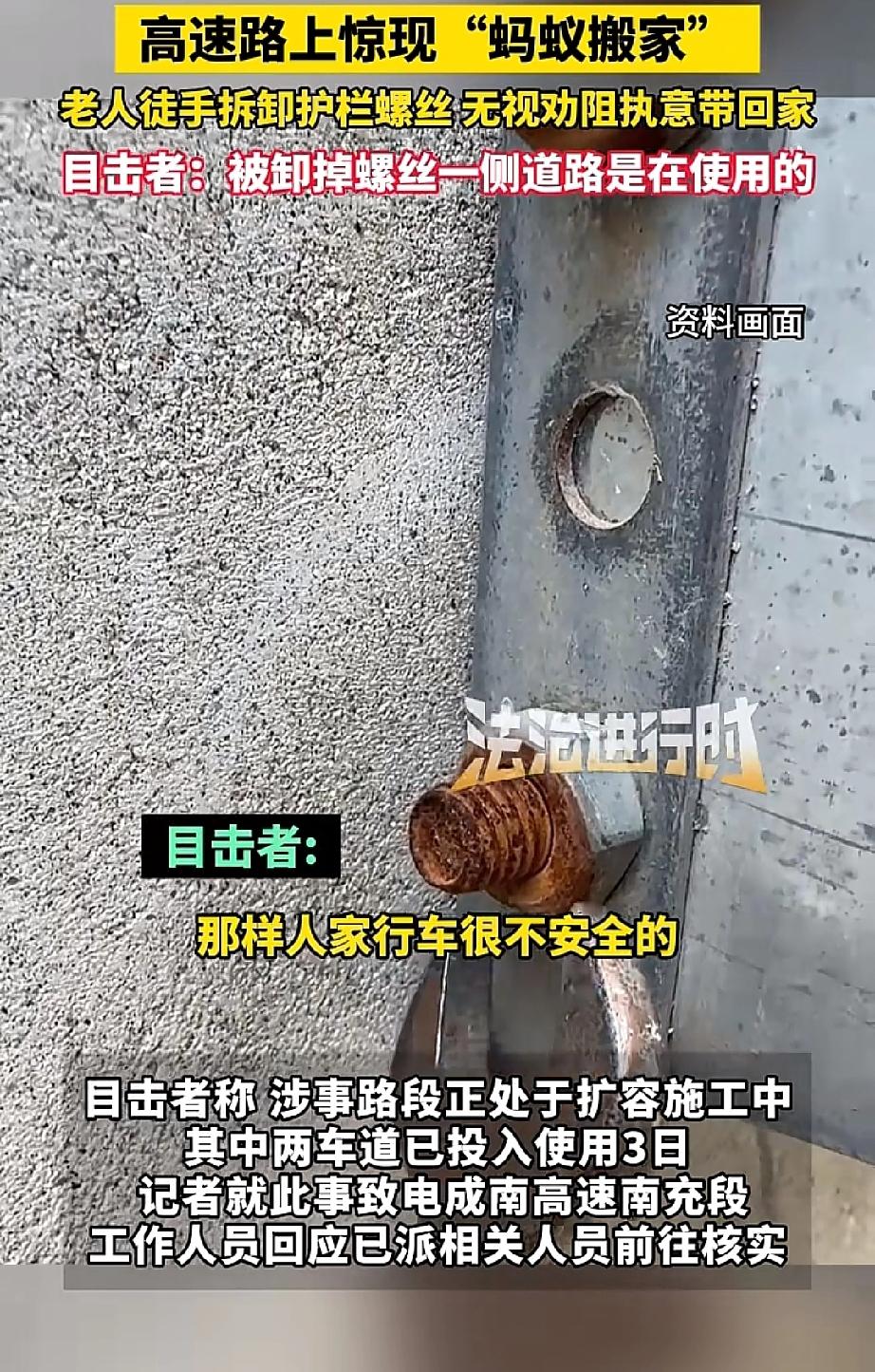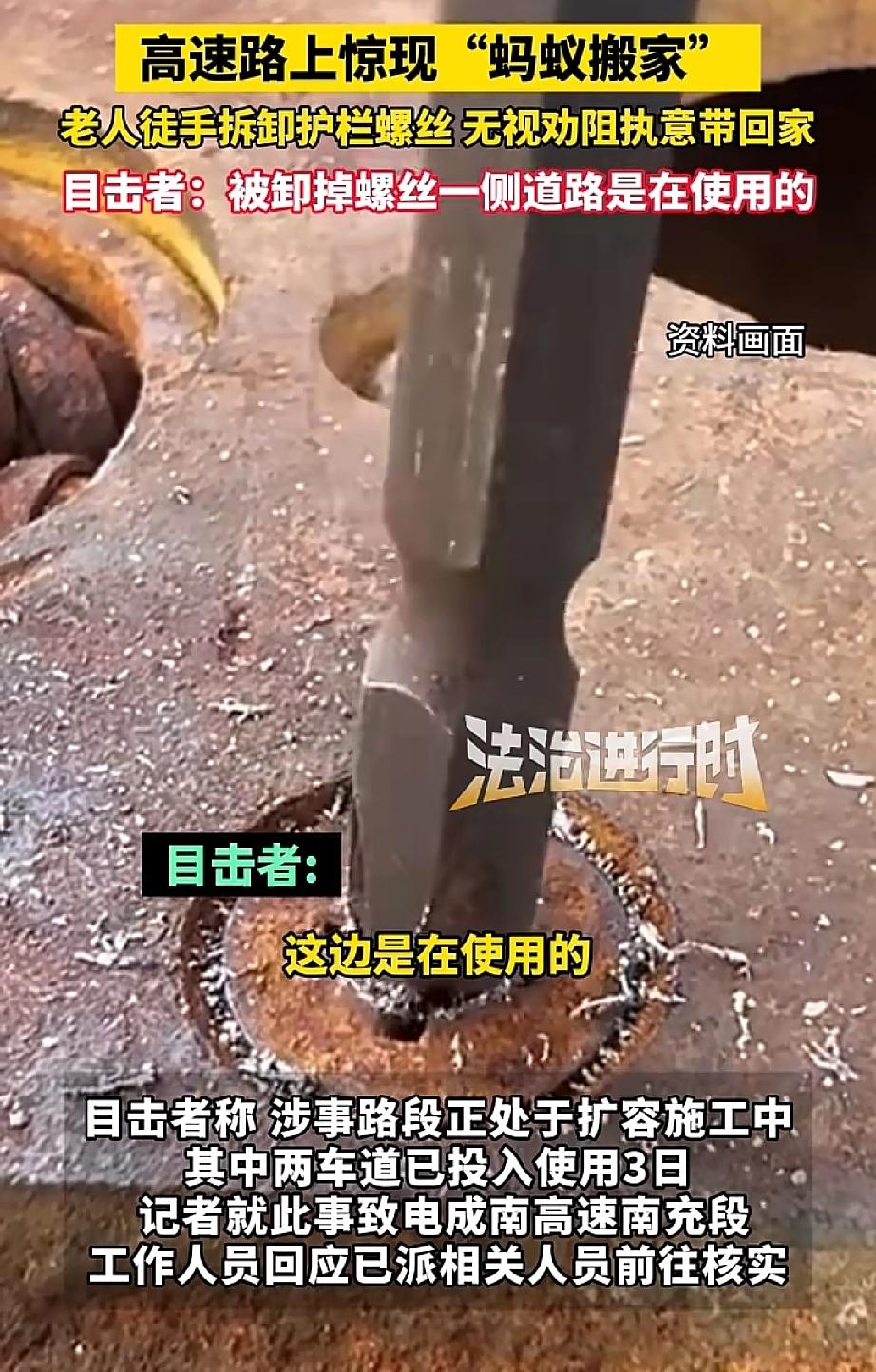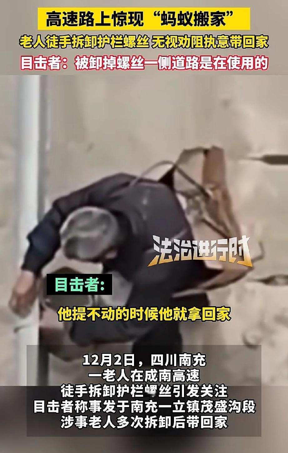 四川南充,一位大爷竟去拧高速公路护栏上的螺丝,将螺丝装满袋子后拎回家,随后又返回高速接着拧。一位小伙见状,赶忙劝阻大爷:“别拧啦,这些螺丝都有用处,您要它干啥呀。”然而,大爷对小伙的话置若罔闻,依旧自顾自地忙活。 小伙透露:“这段高速正在扩容,已有两车道投入使用,大爷拧的那边护栏就在使用中。” 高速公路管理处回应称,已派工作人员前去核查。 明眼人都能看出,大爷要这些螺丝,无非是拿去卖废铁。 但他或许不知道,没有螺丝固定的高速公路护栏,很可能掉落,还可能刮擦路过的车辆。 不得不说,大爷此举已然违法,可能会面临行政处罚,如拘留或罚款。而且,罚款金额可比卖螺丝所得高得多。 公路护栏螺丝并非“无主之物”,而是守护生命的“安全铆钉”!大爷为了那点蝇头小利,撬走的却是道路防护的最后一道防线。 高速行驶时,护栏松动可能致使车辆侧翻;雨夜出行,更易引发连环事故。每一颗被盗的螺丝,都给路人埋下了致命隐患。这种漠视公共安全的自私行为,既触碰了法律底线,更违背了做人的良心。 试问,谁会让人拆自己家的围墙呢?答案显然是否定的。高速公路上的护栏,就如同自家院子的围墙。莫让一己贪婪,成为他人的灾难。 来源:法治进行时