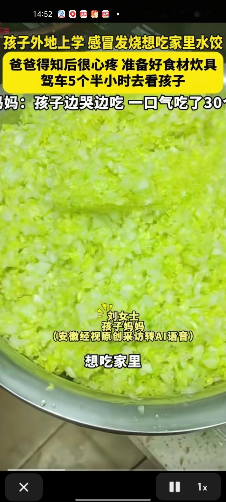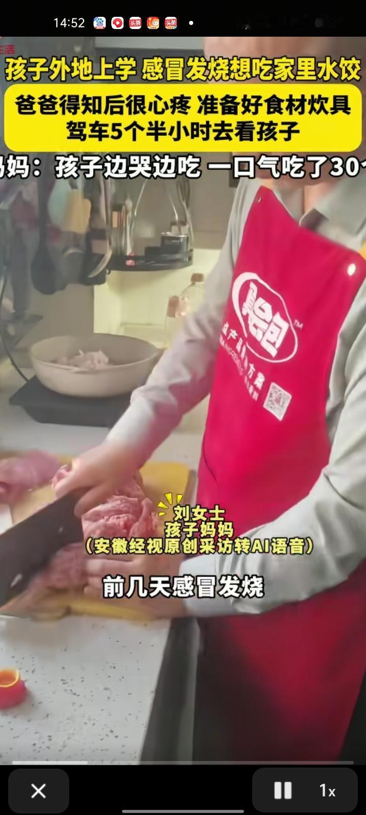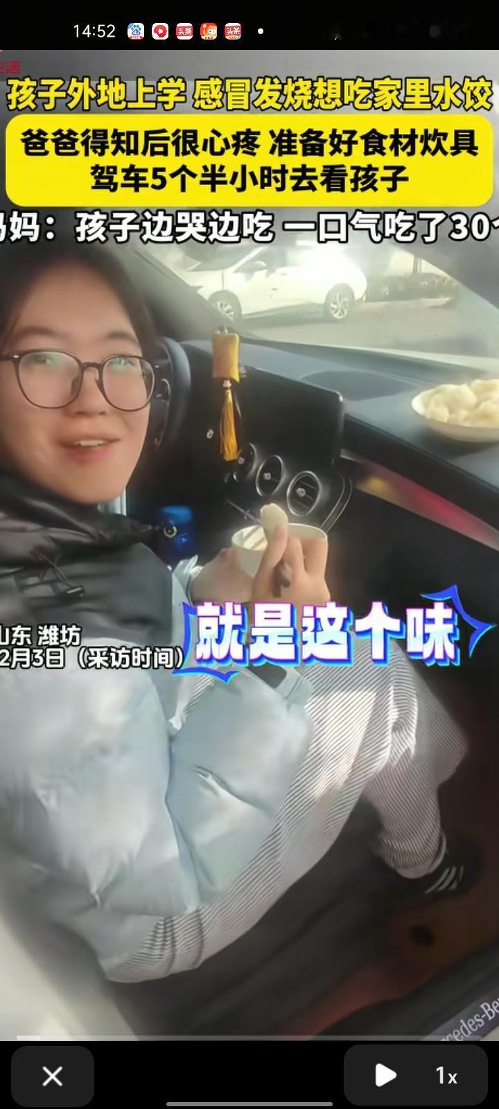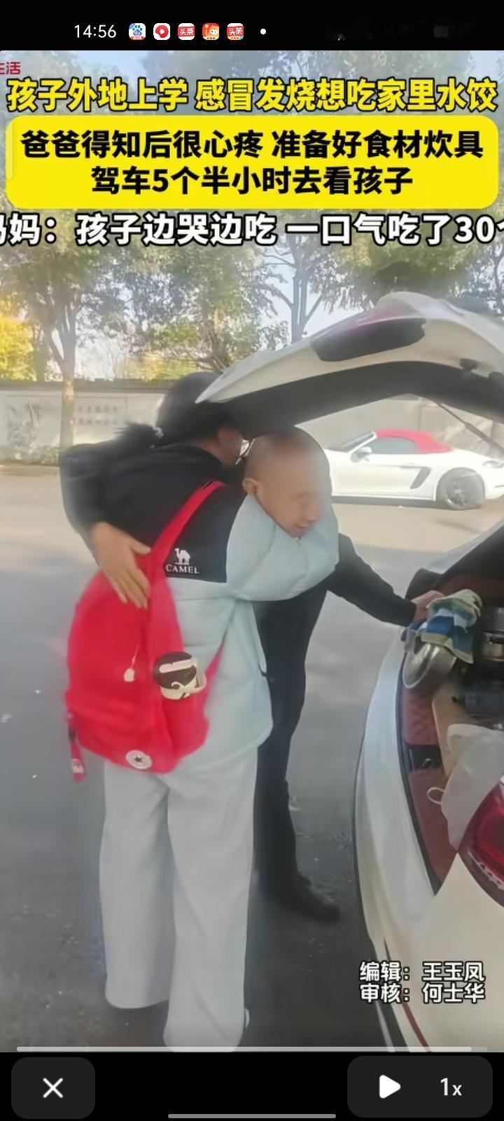 12月2日,潍坊市临朐县。女儿去南京上大学,得感冒发烧,跟爸爸打电话说想吃家里的水饺,爸妈知道后满是心疼,准备好食材、炊具,煮好饺子就出发了去女儿所在的学校。 孩子妈妈刘女士称,女儿边哭边吃,一个劲的说“好吃”,一口气吃了三十个,到后一共给女儿做四顿饭。返程前,他爸爸抱了下女儿,说“快过年了,放假就赶紧回家”。