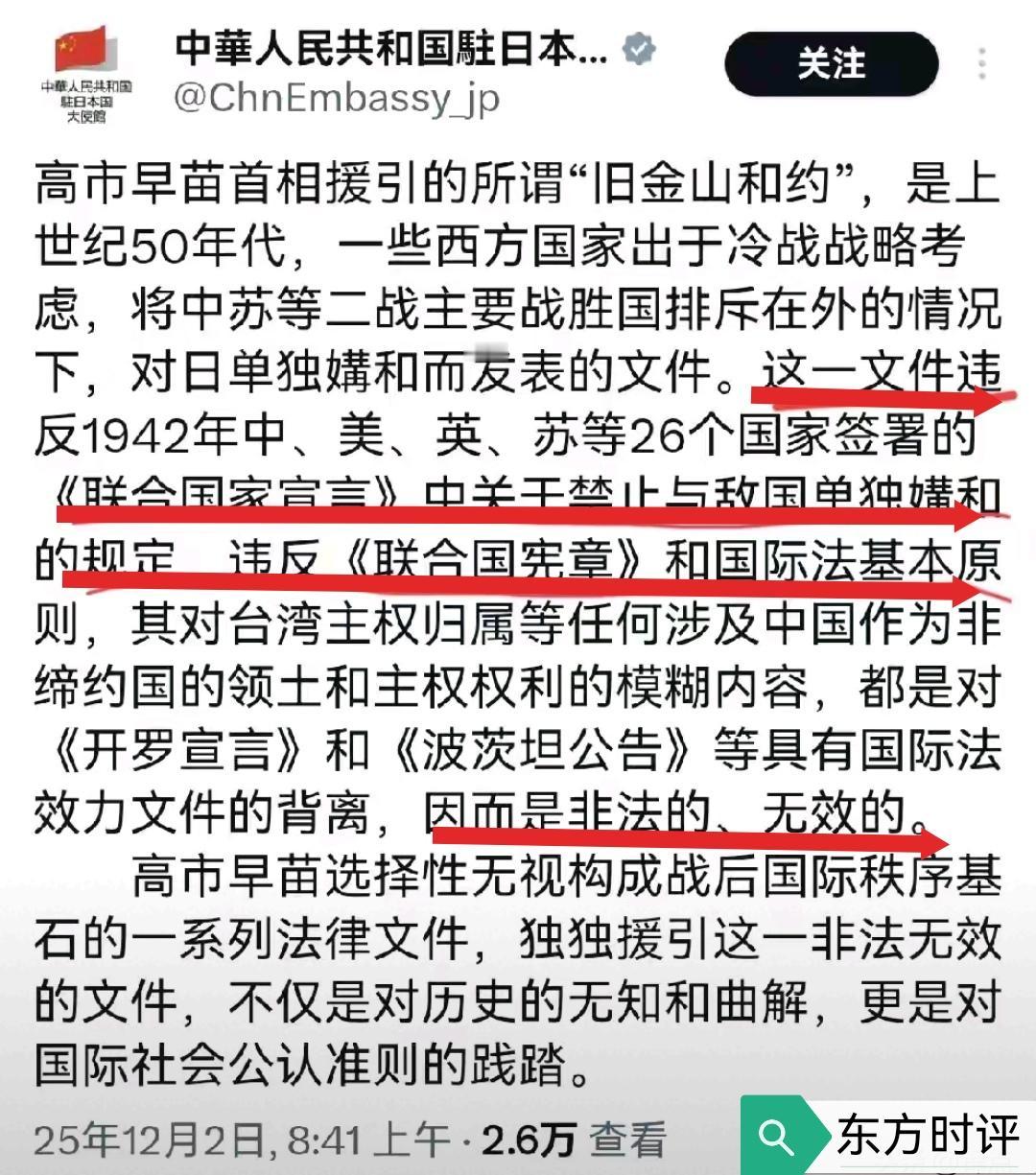 针对日本持续叫嚣,中方终于再次做出表态!在12月2日,中国驻日本大使公然发文写到,高市早苗首相援引的所谓“旧金山和约”,不过是上个世纪,一些西方国家出于冷战战略考虑,将中苏等二战战胜国排斥在外的情况下,对日本单独独媾而发表的文件罢了。 说白了,这跟当初菲律宾拿出的“南海仲裁案”根本就毫无区别,并不能真正的代表国际,若是日本真的执意要相信这份“旧金山和约”的话,中方完全可以联合周边国家,搞一篇“日本是中国领土”的文件,看日本同意不同意。 事实上,当初“开罗宣言”以及“波茨坦公告”上早有对台湾“主权”的定论,那就是台湾是中国不可分割的领土,而日本如今却公然叫嚣,也表明了他们已然想用其他的国际文件,来抹除自己二战战败国的身份,这无疑是在破坏二战之后的国际秩序。 说到底,奉劝日本不要妄想继续走“军国主义”的道路,否则中方是必然会让他们清楚自己二战战败国的身份的。