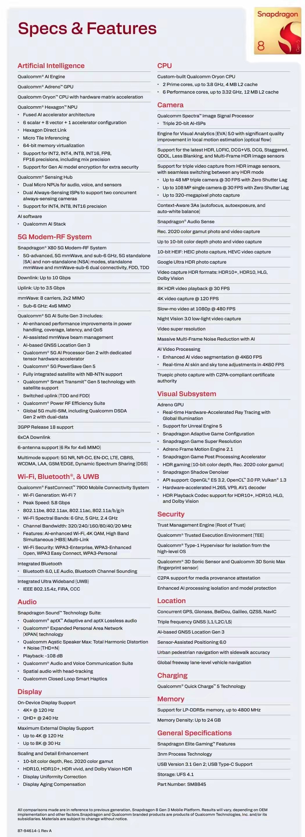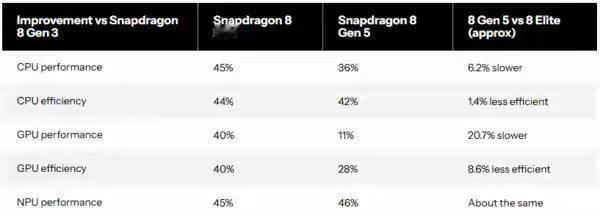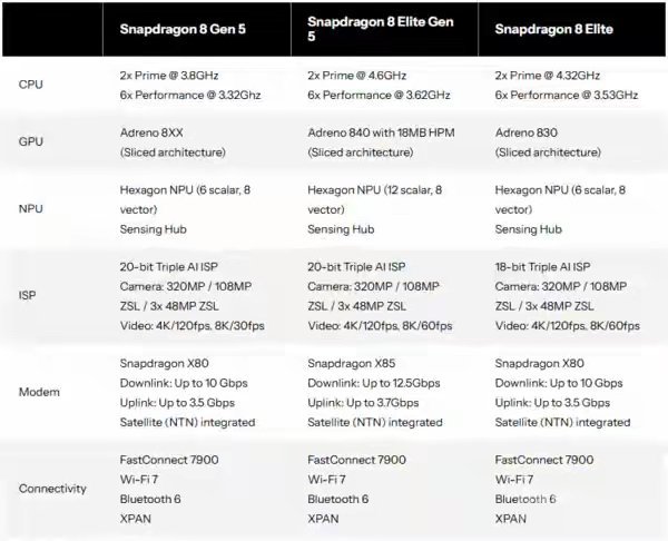 骁龙8 Gen 5新的处理器不如去年发布骁龙8至尊版处理器,性能定位:介于骁龙8 Gen 3与8 Elite至尊版处理器之间性能水平,骁龙8 Gen5性能大于强于骁龙8 Gen 3,弱于骁龙8至尊版,也不如天玑9400+处理器,骁龙8 Gen5就是骁龙8 Gen 3处理器升级版,高通在宣传中直接将骁龙8 Gen 5与2023年的骁龙8 Gen 3对比:CPU性能提升36%,能效提升42%;GPU性能提升11%,能效提升28%。若与2024年的骁龙8 Elite相比,骁龙8 Gen 5的CPU性能约低6.2%,GPU性能则落后约20.7%。【骁龙8 Gen 5】的详细规格:台积电3nm N3P工艺(骁龙8E5/天玑9500同款);高通第三代Oryon CPU(骁龙8E5同款);2颗3.8GHz的“超级内核”+6颗3.32HGz的“性能核”(超级内核4MB L2+性能核12MB L2,而骁龙8E5/8E都是12MB+12MB的L2);GPU是双簇8CU的Adreno 840/原Adreno 829,1225MHz(8E5/8E都是三簇12CU);最高支持9600Mbps的LPDDR5x内存+UFS 4.1闪存;骁龙X80 5G基带(8E同款),搭配FastConnect 7900(8E5同款)/7700。支持20bit的AI ISP,最高支持8K 60fps录像。