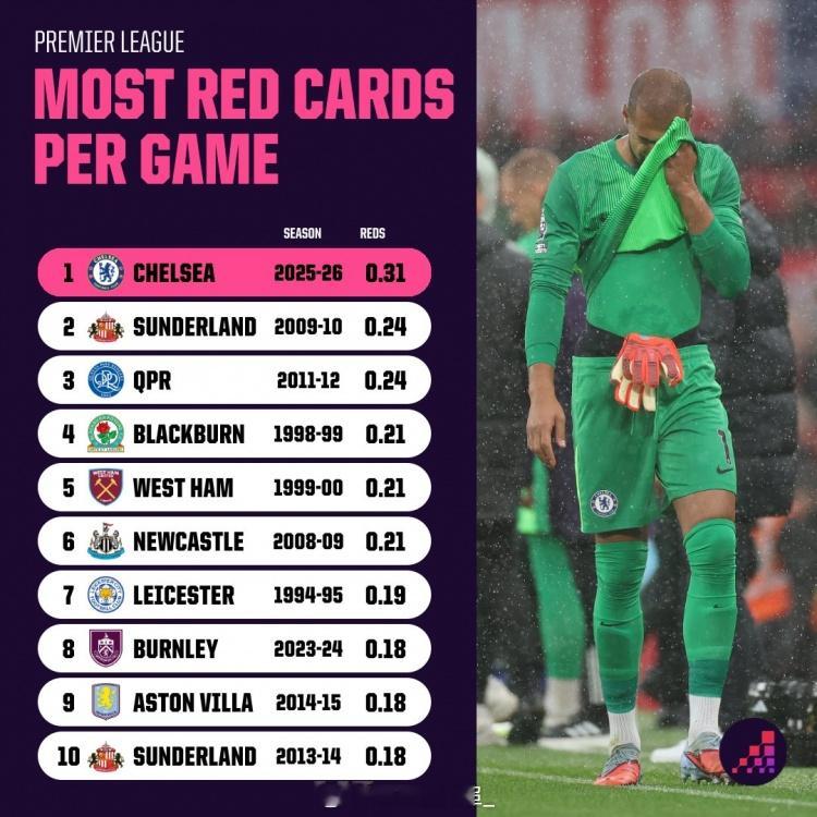 英超历史单赛季场均红牌数量排名:切尔西(25-26)——0.31桑德兰(09-10)——0.24女王公园巡游者(11-12)——0.24布莱克本(98-99)——0.21西汉姆(99-00)——0.21纽卡(08-09)——0.21莱斯特城(94-95)——0.19伯恩利(23-24)——0.18维拉(14-15)——0.18桑德兰(13-14)——0.18