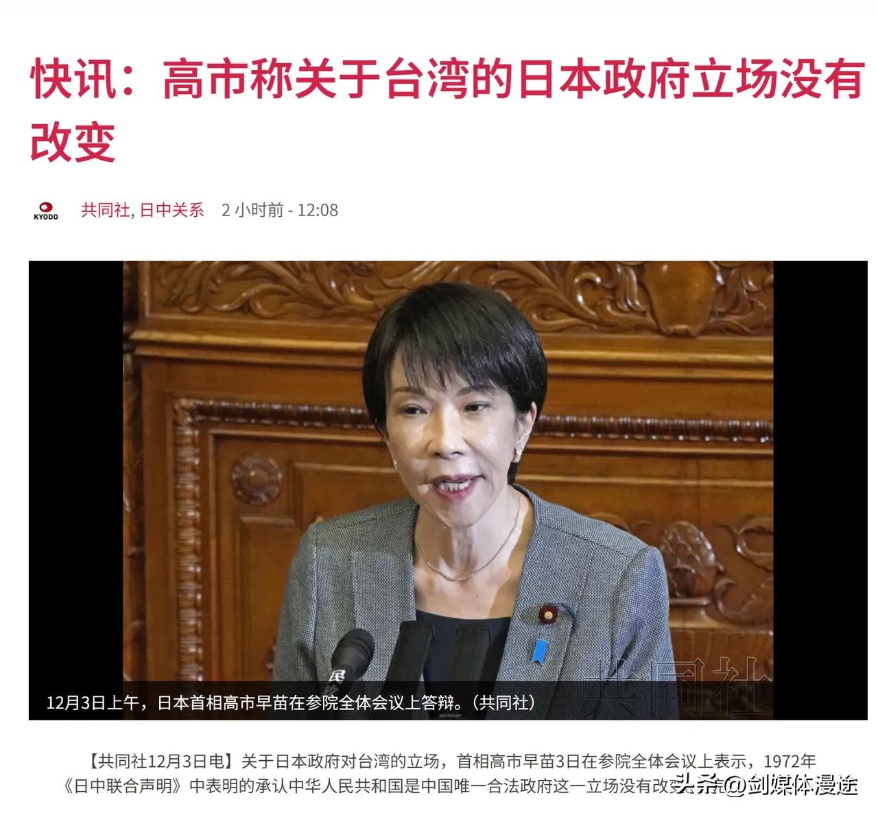 12月 3 日,高市早苗绕回到《中日联合声明》立场,但还不够! 日本首相高市早苗在日本参院全体会议上表示,1972年《日中联合声明》中表明的承认中华人民共和国是中国唯一合法政府这一立场没有改变。 这么一看 高市从一个原本错误且非法的 《旧金山和约》又绕回到正确的合法的《日中联合声明》上来,如此改变,并不能代表高市的良心发现,只能证明中方的力道压得很到位,日本国内经济白哗哗的银子一点一点的的流失,心疼呀。同时日本国内的经济体及在野党跨党联盟申请访华,期待改善中日关系,日本民众上街要求高市下台的呼声越来越大。在如此之国内与国外的强压之下,高市早苗受压之后走回到正道上来,承认中华人民共和国是中国唯一合法政府的立场没有变。 不过高市更像是在挤牙膏的方式,除了《中日联合声明》之外,中日之间的四个政治文件精神 没有提到,这也是高市接下来要提出来的中日关系的基础文件。高市需要很完整的来表述中日之间的关系,把两国之间的友好建交的及承诺的文件完全表述出来,并亲口承认中日双方建交文件重要性! 最后,中国的要求:11 月 7 日就“台湾有事”及可能构成“存亡危机事态”的这些话必须撤回!日方妄想通过“不再提及”淡化搪塞掩盖高市早苗的严重错误言论,是掩耳盗铃、自说自话,中方绝不接受。