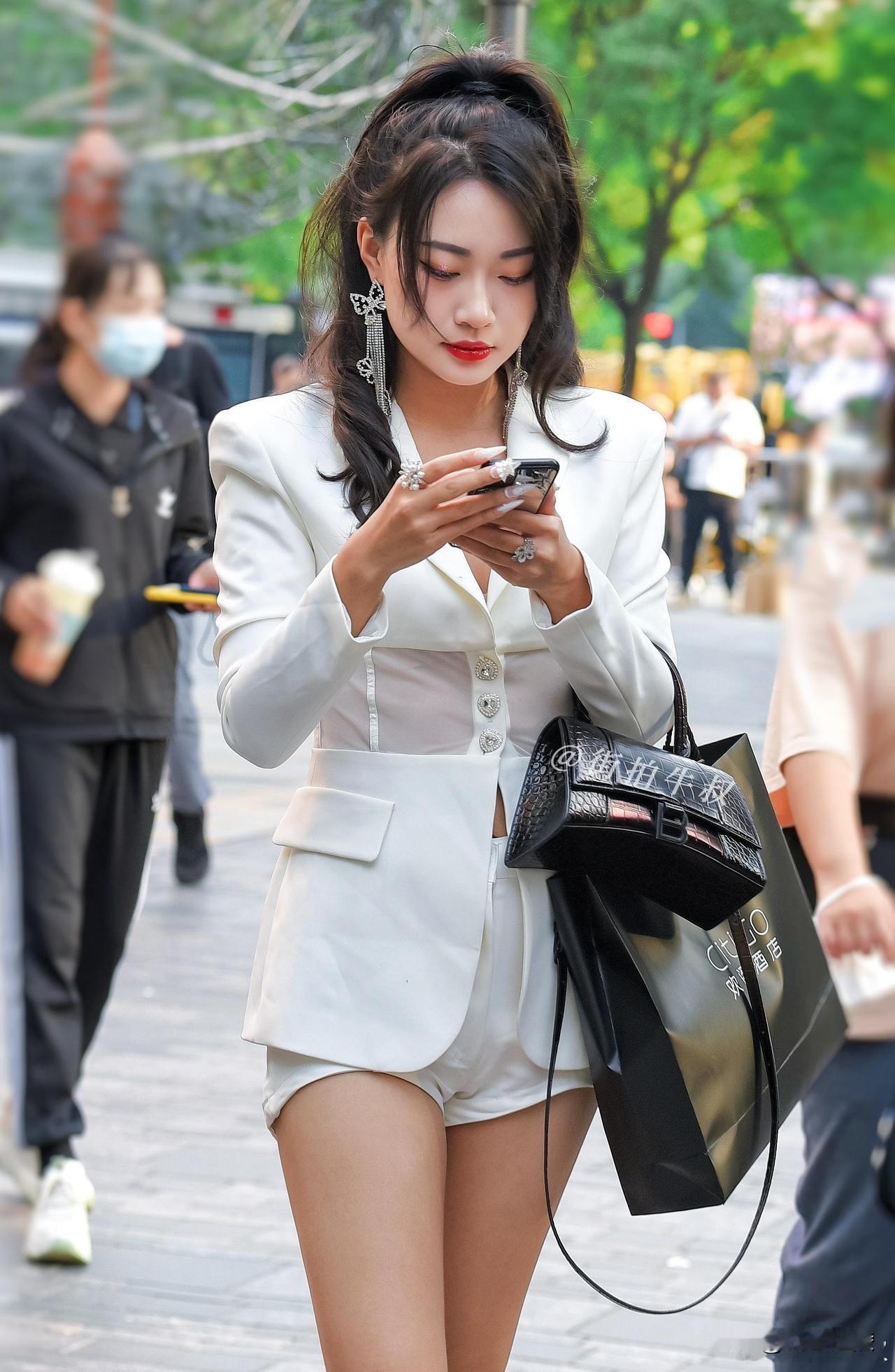 哎呀,这妹子白色裤子挺括有型,搭配黑色上衣简约大方,手提银色包包时尚感十足,走路
