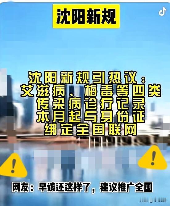沈阳这波操作太敢了! 艾滋病、梅毒等四类传染病 诊疗记录绑定身份证全国联网, 可不是要公开处刑,而是找对了隐私和公共安全的平衡点。 别再说这是歧视,真正的歧视是隐瞒病史让无辜者买单。 多少人在不知情中被感染,一辈子被病痛捆绑? 联网让疾控能精准锁定高危人群,也倒逼患者不敢隐瞒,这才是对所有人负责。 而且这不是一刀切暴露隐私,有严格的权限管控,只有医护和疾控人员能因工作调阅,还得加密保护。 比起绝对隐私,每个人的健康权才该被优先重视,毕竟没人该为别人的隐瞒付出健康代价。 你觉得全国推广该加点啥细节更稳妥? 是保留患者授权功能,还是细化信息保密规则? 来评论区聊聊你的看法~