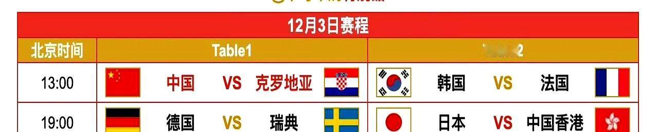 明日(12月3日,周三)赛程! 他们把第二阶段的赛程排得满满当当,中午和晚上都同时安排了两场对决。 这让我们必须做出选择,在同一时间里决定要把目光锁定在哪一张球台。 所以他们特地指出了中国队的比赛是在中午一点,就是让我们提前把时间空出来。 我们也就早早调整好自己的安排,准备好了为他们加油。