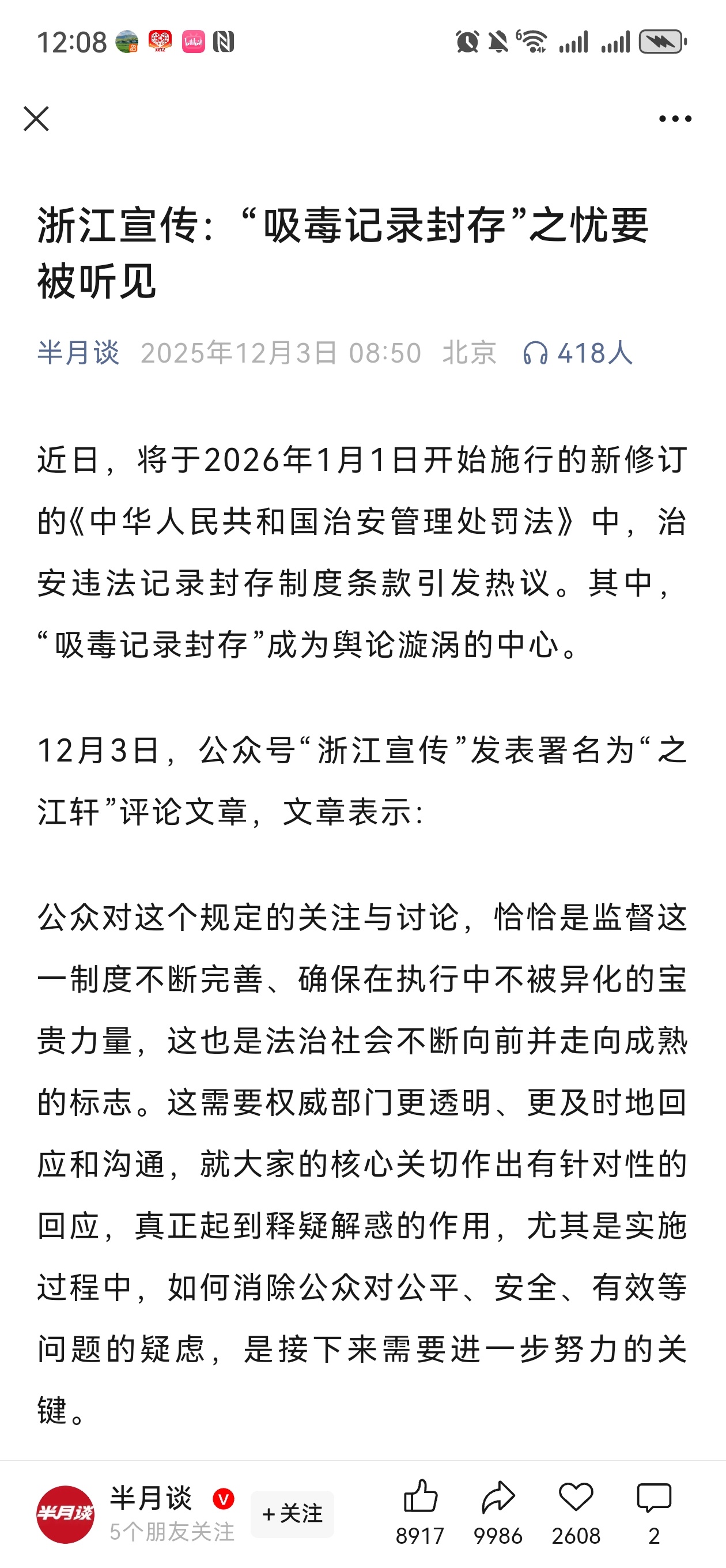 半月谈转发了浙江宣传的(“吸毒记录封存”之忧要被听见)的文章,感觉到了正义派和毒瘤派的博弈