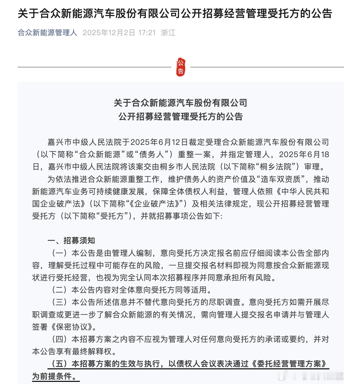 哪吒汽车重整哪吒汽车母公司公开招募经营管理方 哪吒母公司合众再次发布关于重整计划的公告,将要公开招募经营管理受托方。哪吒当初一度也是新势力的“龙头”,其陨落的速度真的远超我们想象,也是所有新造车品牌需要警惕的一个案例。不过,虽然哪吒的品牌价值已经没有多少了,但是造车资质还是相当值钱的,就看有没有还想躬身入局造车的大佬,来挽救他们以及是无数哪吒车主于水火吧......