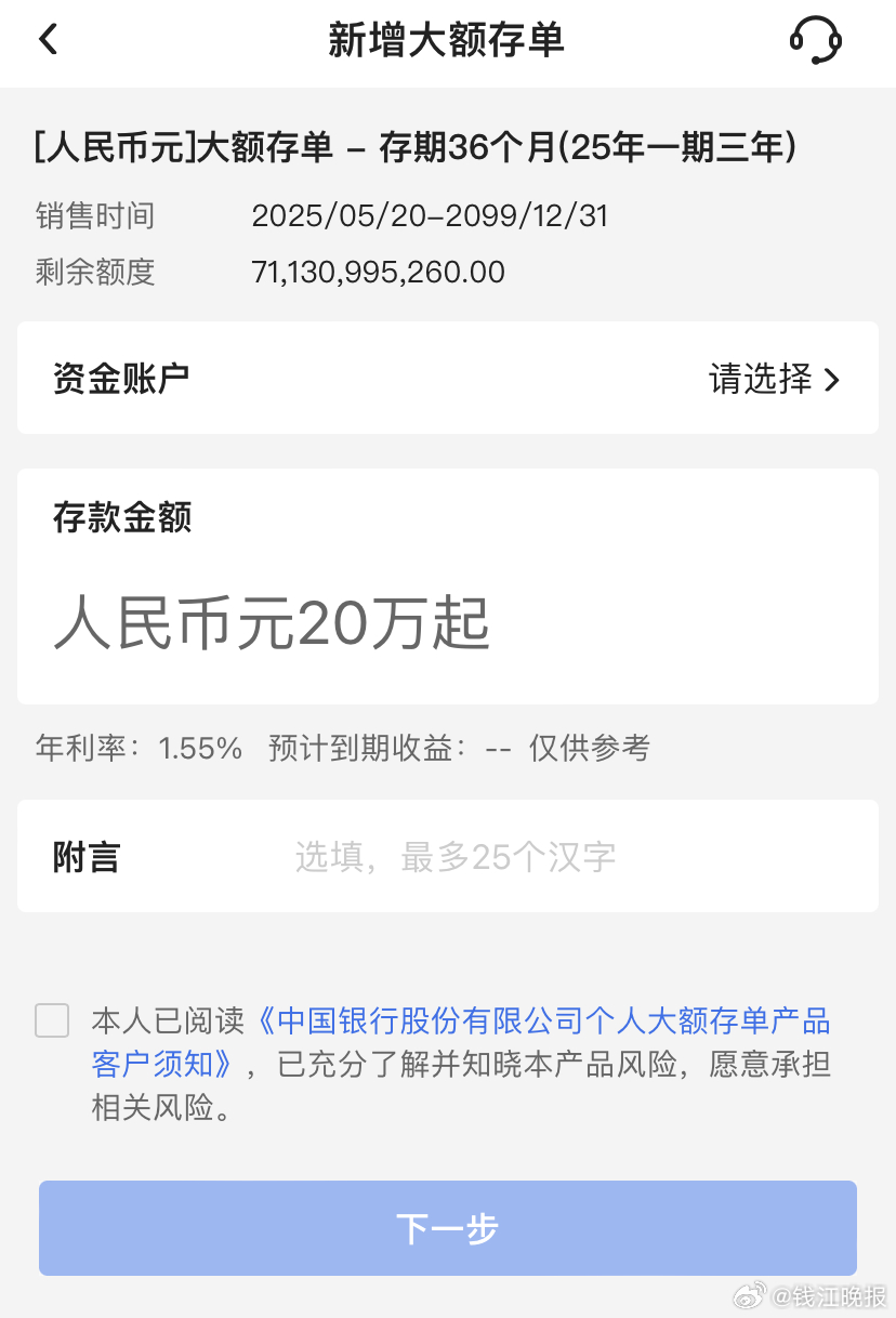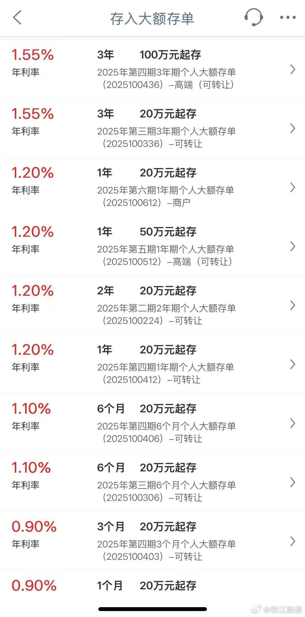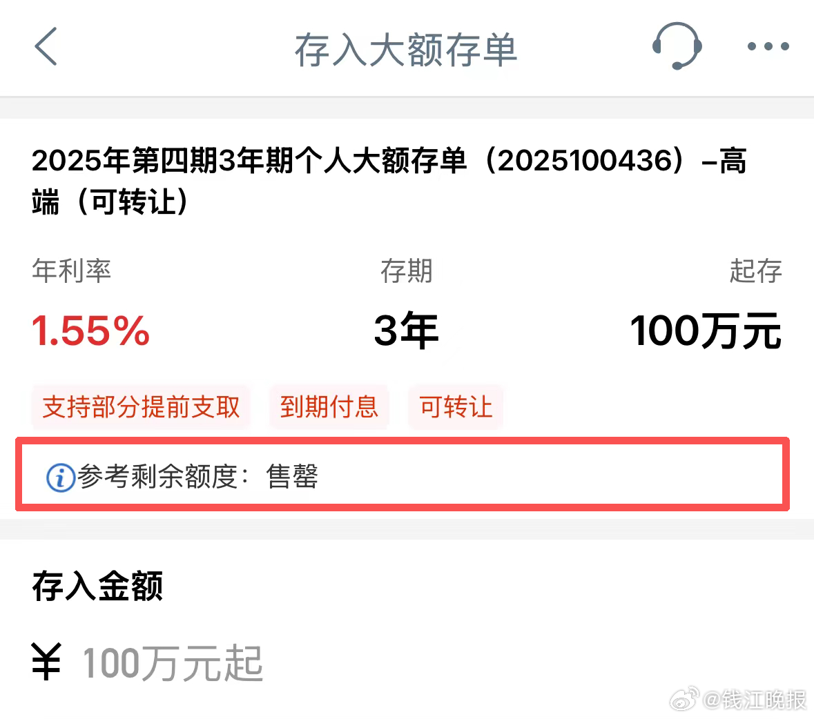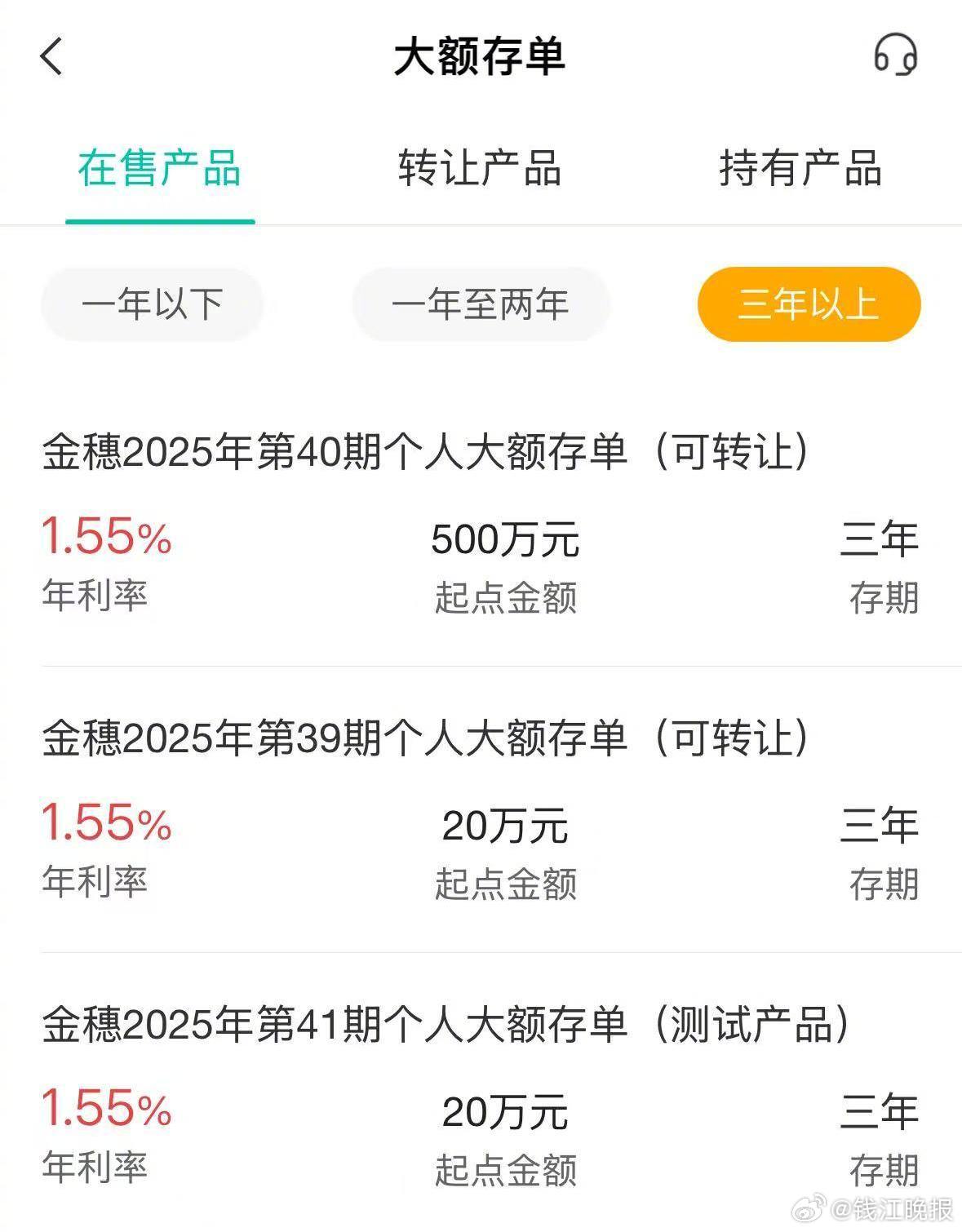 【#有银行3年期大额存单门槛500万#】今天,#工行三年期大额存单门槛100万元#话题登上微博热搜,引发热议。实际上,潮新闻记者采访发现,“六大行”基本已经下线了5年期的大额存单产品,而且部分银行的3年期大额存单门槛已经提高到了500万元,年利率仅为1.55%。今天,潮新闻记者登录工商银行APP,在“大额存单”栏目中看到,排在第一个的产品为2025年第四期3年期个人大额存单,起步门槛标注为“100万元起存”,年利率为1.55%。点击进入产品详情页,页面显示产品已经售罄。潮新闻记者看到工商银行目前在售的大额存单产品期限从1个月到3年不等。不过,记者发现,50万元起存的1年期产品、20万元起存的1年期产品等多为“售罄”状态。随后,记者登录农业银行APP,该行在售的最新一期3年期大额存单产品:“金穗2025年第40期个人大额存单(可转让)”,起点门槛竟然高达500万元,利率同样为1.55%。相比之下,中国银行目前仍有20万元起存的3年期大额存单在售,且额度充足。招联首席研究员、上海金融与发展实验室副主任董希淼指出,部分银行近期对大额存单产品的调整并非孤立事件,或是反映了行业性的趋势:商业银行正在将传统的大额存款产品转变为客户关系维护工具。董希淼表示:一方面,银行通过提高门槛、稳定利率,一定程度上能 “劝退”部分普通储户,从而降低高成本负债规模,努力维持息差基本稳定;另一方面,部分银行将稀缺的中长期存款额度,作为服务高端客户或吸引他行优质客户的专属资源。对这些客户来说,1.55%的存款利率并非核心吸引力,资金的安全、稳定和银行的专属服务才是关键。此外,在大额存单额度受限的情况下,用一个100万的客户“平替”5个20万的客户,一定程度上有助于降低运营和管理成本,将有限的存款资源用在“刀刃”上。你手里如果有一笔闲钱,会选择如何打理?欢迎来评论区留言。(潮新闻 记者 陈晔)