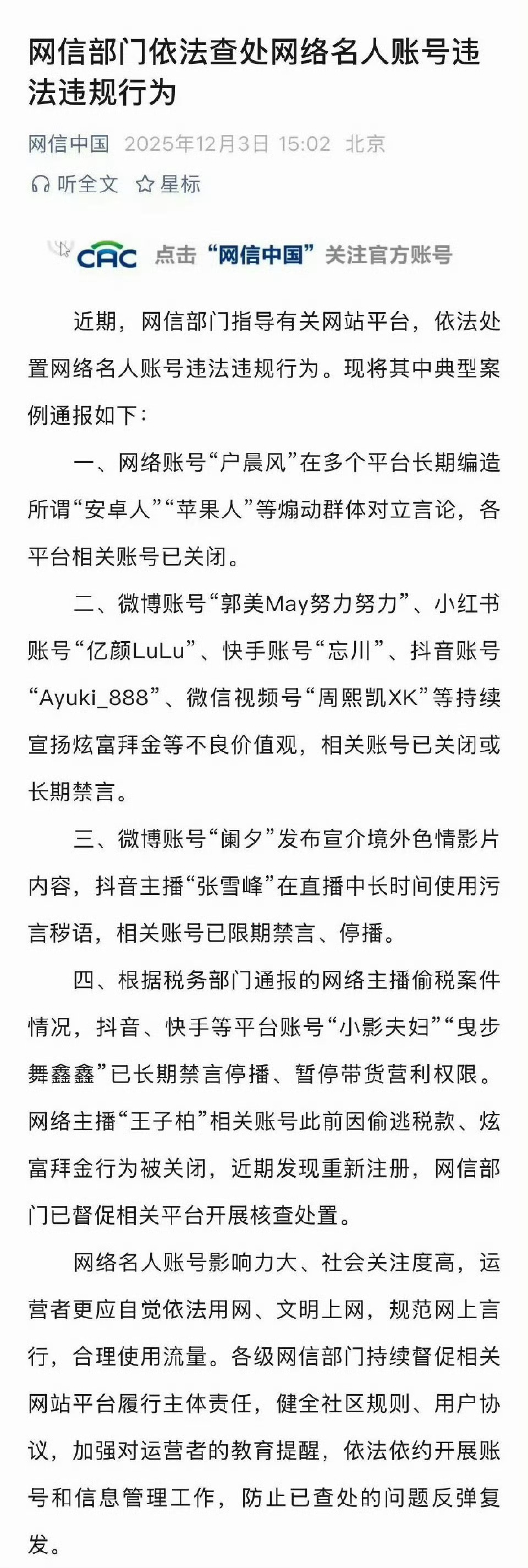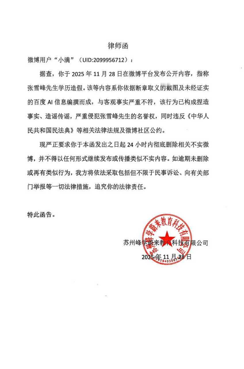 12月3日,“张雪峰”因在直播中长时间使用污言秽语,再次被限期禁言、停播。从涉嫌围绕就业、教育领域“贩卖”焦虑带货卖课,到“为了看全运会开幕式,连伍佰的演唱会都没去”的言论翻车,再到直播间破防后各种脏话,张雪峰不配为人师表。网络名人账号违法违规行为被查张雪峰称已经深刻反省另外,个人好奇的是,知名考研辅导网红张雪峰,早年自称是清华大学或北京大学研究生,他的学历到底有没有造假?个人质疑后,居然收到了张雪峰团队的律师函,这是有多心虚?希望相关院校给出确认回应。擅长于爱国人设营销的张雪峰,在言论翻车后,刻意避重就轻,绝口不提自己撒谎造假的诚信危机,反而骂街式回怼网友。作为一名教育博主,不管再怎么破防,面对直播镜头也应该保持最基本的文明。靠着家长面对教育的焦虑心态,起号卖课的张雪峰,已然被流量惯坏了,极端功利主义正让他变得扭曲。互联网的算法时代,可以把张雪峰捧成千万粉丝的教育导师,却无法在短时间内,赋予他相匹配的认知能力与道德自觉。流量是双刃剑,同时也极具脆弱性,网红们纵使拥有千万级粉丝体量,若罔顾公序良俗、突破法律底线,再旺的人气也会瞬间崩塌。网信部门通报处置张雪峰