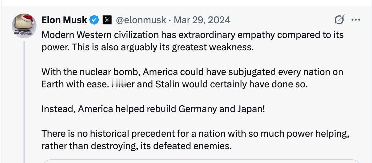 马斯克这是在装憨,还是就是地缘政治的白七 竟然海吹美国是“仁慈的霸权”,这滤镜怕是厚过马里亚纳海沟了吧! 他狂赞美国手握核弹却没统治世界,反而帮德日重建,“史上最善心霸权”!听笑了 ——这话术精致得跟美颜十级似的。 是是是,美国确实没把德日变殖民地,但美军基地可是扎在那儿几十年没挪窝啊! 马歇尔计划是给钱,但顺带也把政治经济绑得死死的,这是是慈善?分明是高端VIP版控制。 再看看美国的“后院”—— 拉美各国穷得叮当响,政变、制裁、香蕉战争可没少插手。 “离天堂太远,离美国太近”——这话可不是白说的。 合着“仁慈”还分VIP区和贫民窟? 对战略棋子掏钱重建叫“同理心”,对后院邻居敲骨吸髓叫“命运”? 这双标玩得,连奥斯卡都欠美国一座小金人! 老马啊,少泡在星链上看数据,多低头看看历史书—— 恶霸就是恶霸,带着白须披层羊绒服也变不成圣诞老人。 Source: X