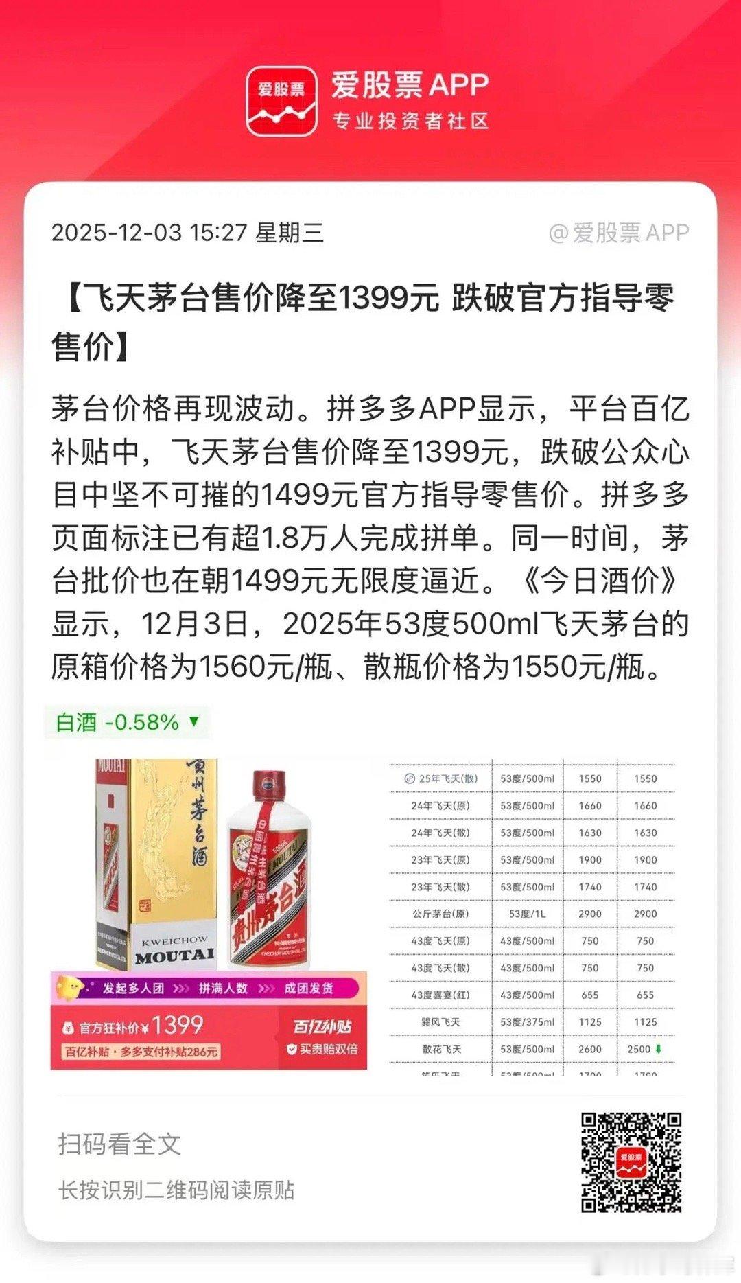 看到新闻说,飞天茅台在拼多多竟然跌到1399元了,跌破1499的官方指导价,这个问题就比较严重了!原因是,国人有囤茅台酒的习惯,经销商也有囤茅台的习惯。现在这些人都在纷纷割肉出逃,茅台价格可能走向失控。茅台为什么不稳价格?因为稳不住,跟房地产一样,但凡是有金融属性的产品,跌起来总会跌过头,因为得等到恐慌盘割完肉才行。对茅台来说,生意模式依然非常优秀,茅台的需求还是存在。但去掉金融属性,去掉炒作,回归正常的消费...这个过程也会是阵痛!总之,飞天茅台不见底,白酒板块就很难见底,那么大消费就很难起来。当然说的是老登消费,新消费(泡泡玛特等)、服务消费(旅游等)这些年轻人的消费,可能会率先走出来。对整个大消费板块也不用悲观,都跌了这么多年,也不在乎继续躺几个月了。