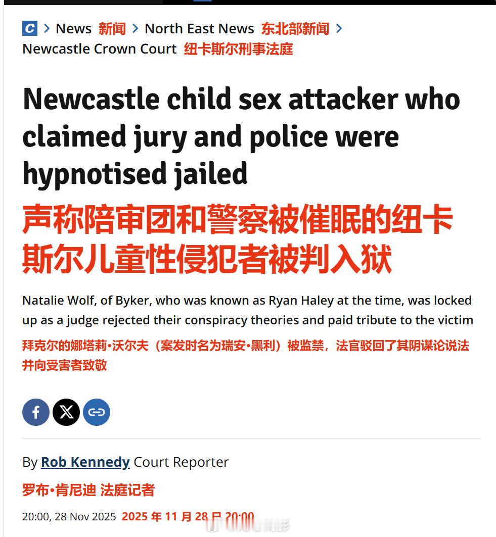 英国,在纽卡斯尔刑事法庭的陪审团审判中,一名跨性别者被判定犯有儿童性犯罪。ta化名"娜塔莉·沃尔夫"(本名瑞安·哈利,现年47岁)对一名 13 岁女童实施性侵。此案历经数年才得以开庭审理,受害者都成年了。庭审时,嫌疑人为了脱罪,还声称陪审团和警方被“催眠”,他还指控受害者撒谎,声称凶手另有其人,并表示希望上诉。沃尔夫还补充道:“我对女性根本没有那种性吸引力。”。现已成年的受害者女士在法庭上对嫌疑人进行了声泪俱下的控诉。哈利仅被判处三年半监禁,并将被终身登记为性犯罪者。海外新鲜事