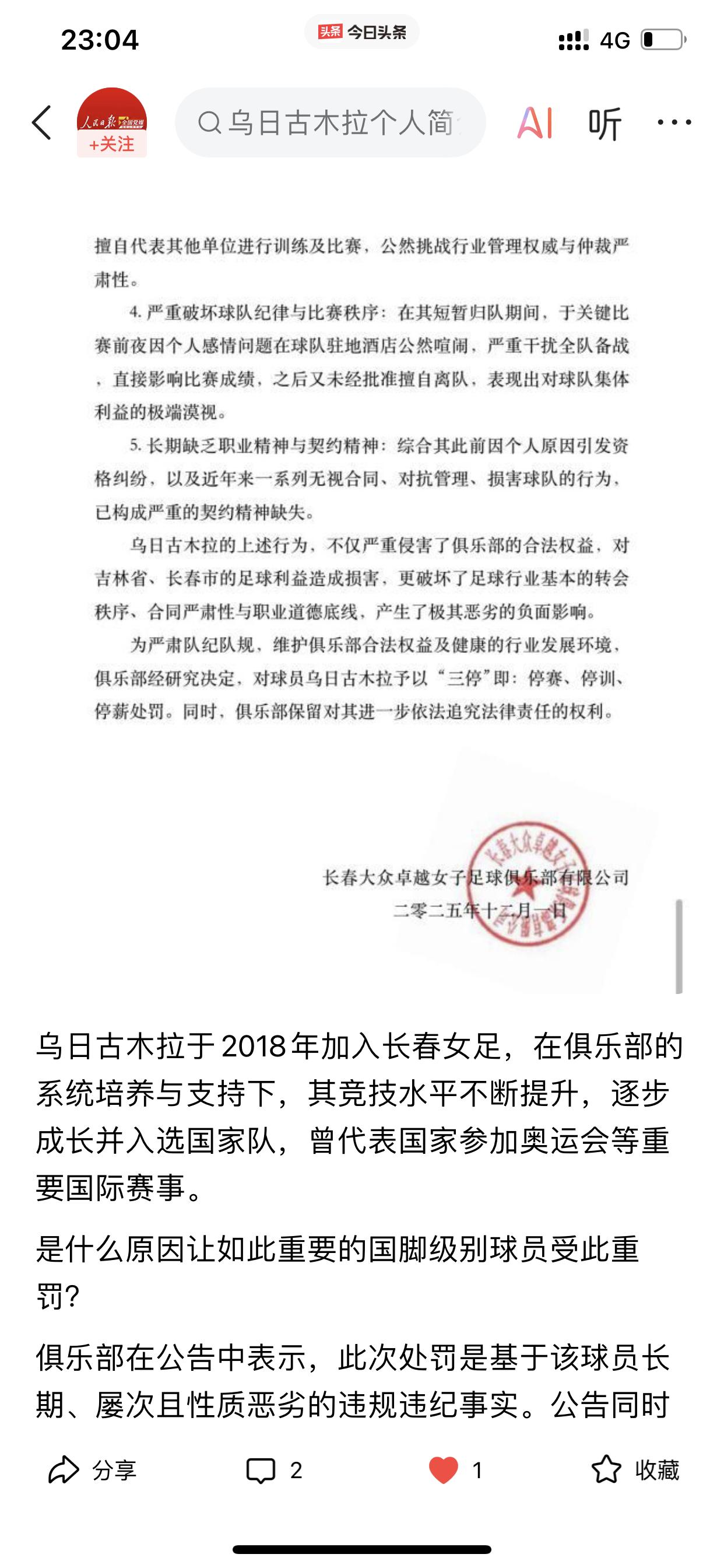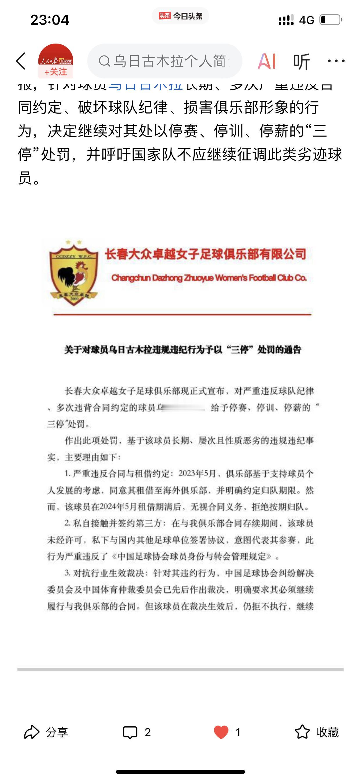 女足球员乌日古木拉被长春女足“三停” 说真的,没想到这个球员竟然做出这样的事情! 也搞不懂她为什么要这样做? 在现行的中国女子足球的大境下,按理说她也没法这样去霍霍呀! 再说了,就她的个人水平,哪里来的底气如此去干这样的事情? 而且她这样做之后,难道另外的女足俱乐部就能把她当宝了? 这看着怎么都觉得不可思议!