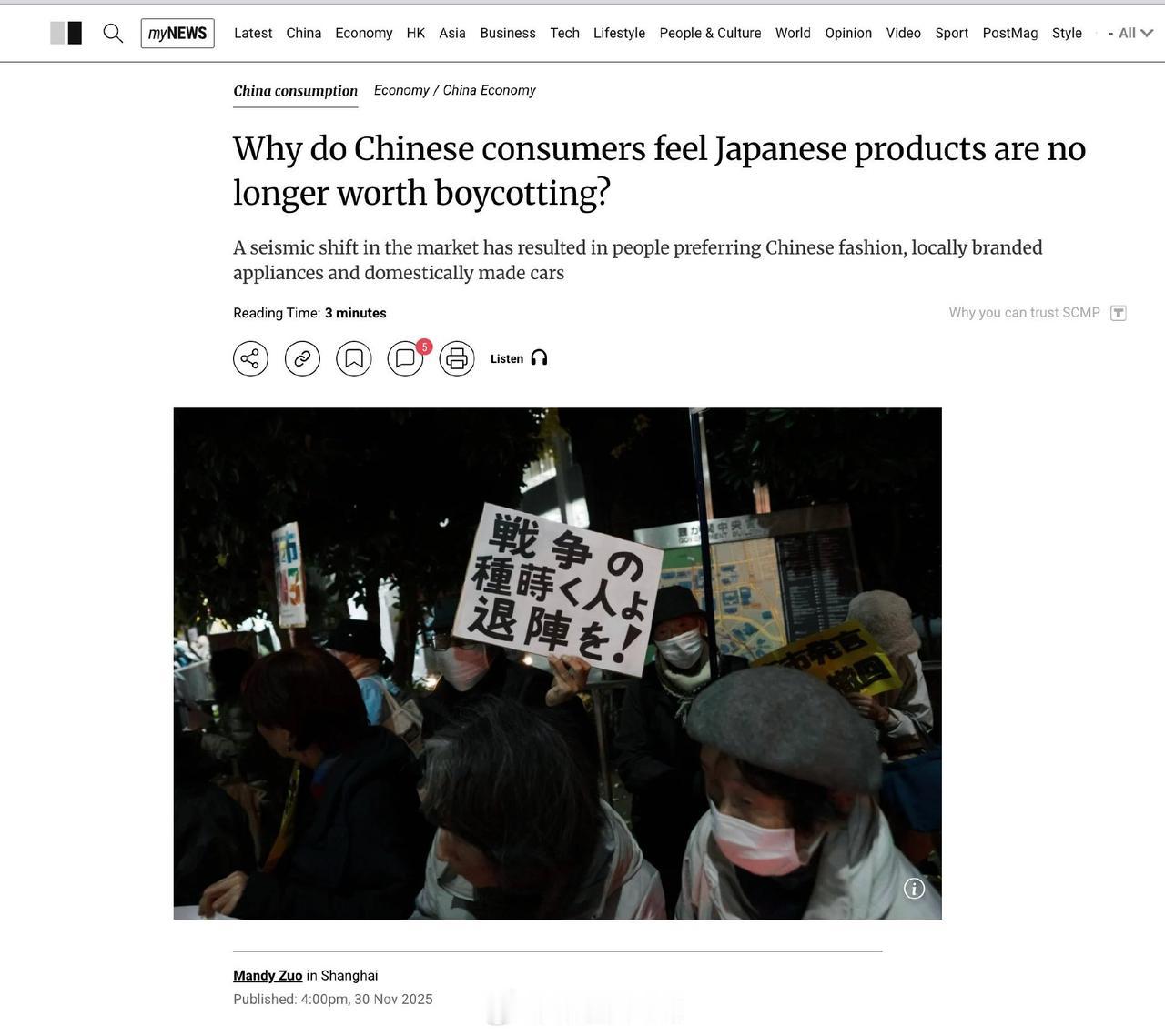 日本不愿承认的地缘政治真相:日本其实不是担心战争,而是担心被边缘化 10多年前,因钓鱼岛事件中国人出于愤怒抵制日本产品。2025年日本民族主义者出于恐惧抵制中国产品。这就是情绪与现实的区别:愤怒是可选择的,而恐惧是结构性的中国不再需要通过抵制来展现民族主义,其本土品牌在竞争中已经胜过日本品牌。汽车、电子产品、时尚服饰、家电等市场悄然发生了果断的转变。在中国,几乎没有什么日本产品会让人觉得“值得抵制”。与此同时,在日本,民众站在寒风中举着“抵制中国”的标语,不是因为中国产品不好,而是因为日本感到自己的地位正在逐渐丧失。只有当进口商品占上风时,你才会抗议进口商品。当一个国家开始依靠谣言、恐慌和街头表演来展现自身实力时,它展现的不是自信,而是走向灭亡。世界变了,但日本没有变。 “抵制中国”的呼声越高,这个事实就越发清晰。