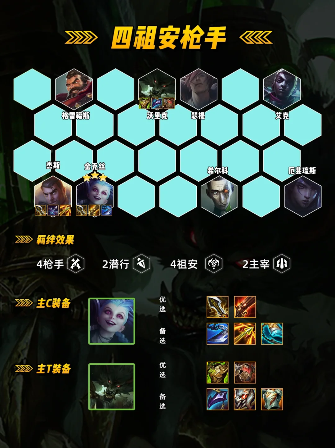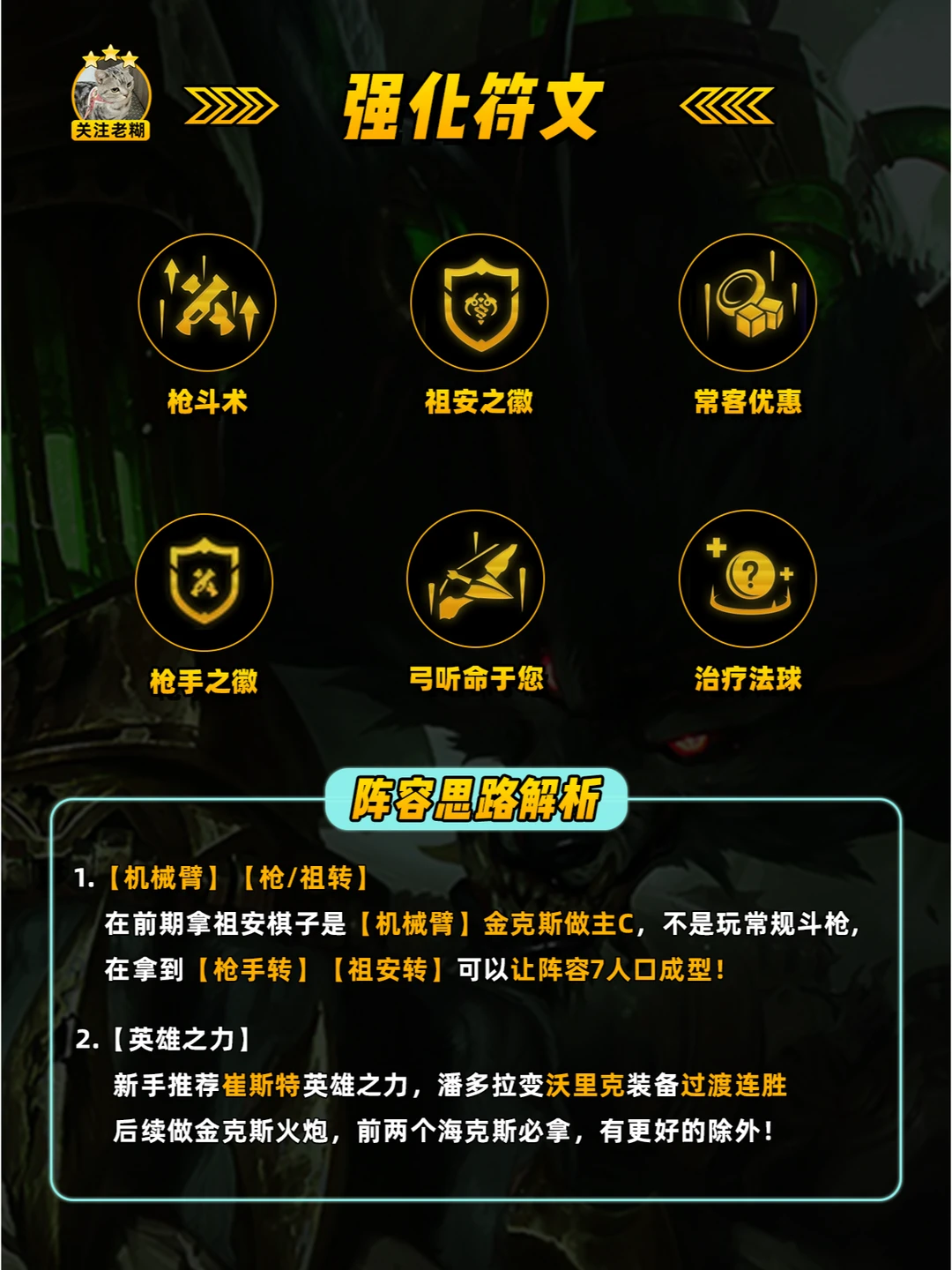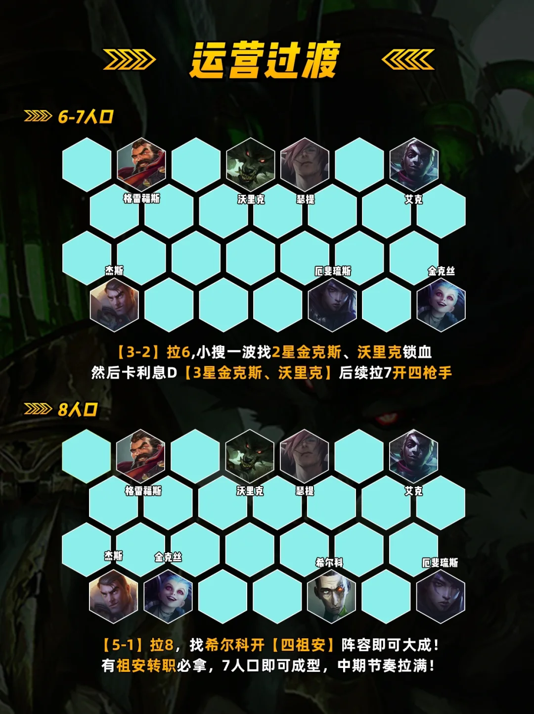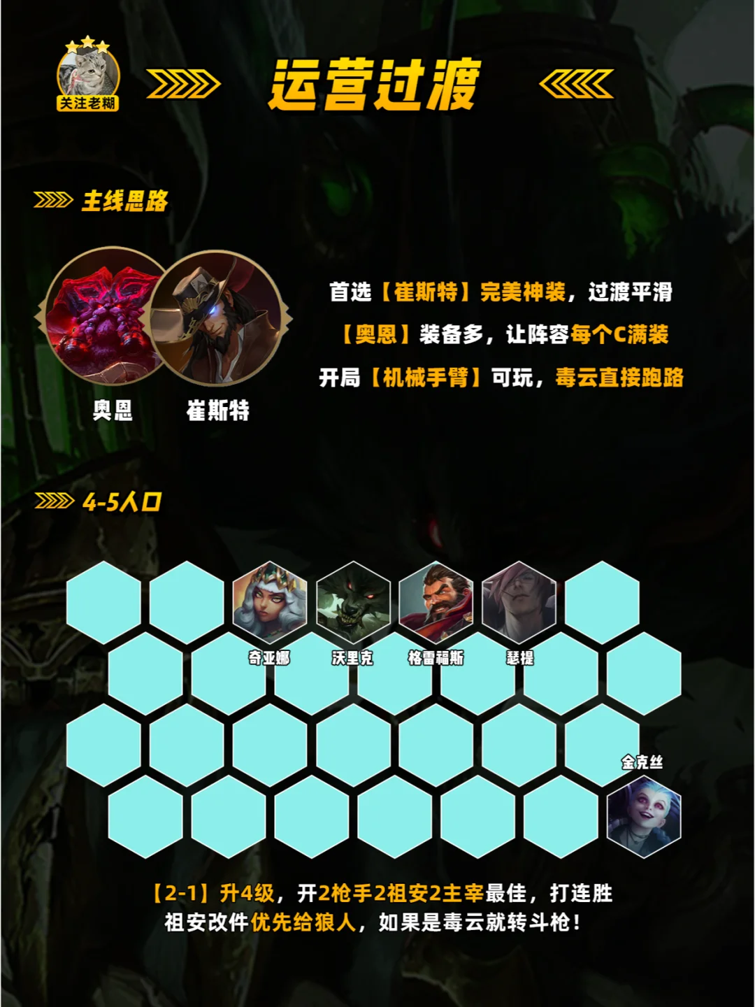 [机械臂] [枪/祖转] 在前期拿祖安棋子是[机械臂]金克斯做主C 不是玩常规斗枪在拿到[枪手转][祖安转] 可以让阵容7人口成型! [英雄之力] 新手推荐崔斯特英雄之力, 潘多拉变沃里克装备过渡连胜后续做金克斯火炮, 前两个海克斯必拿,有更好的除外!