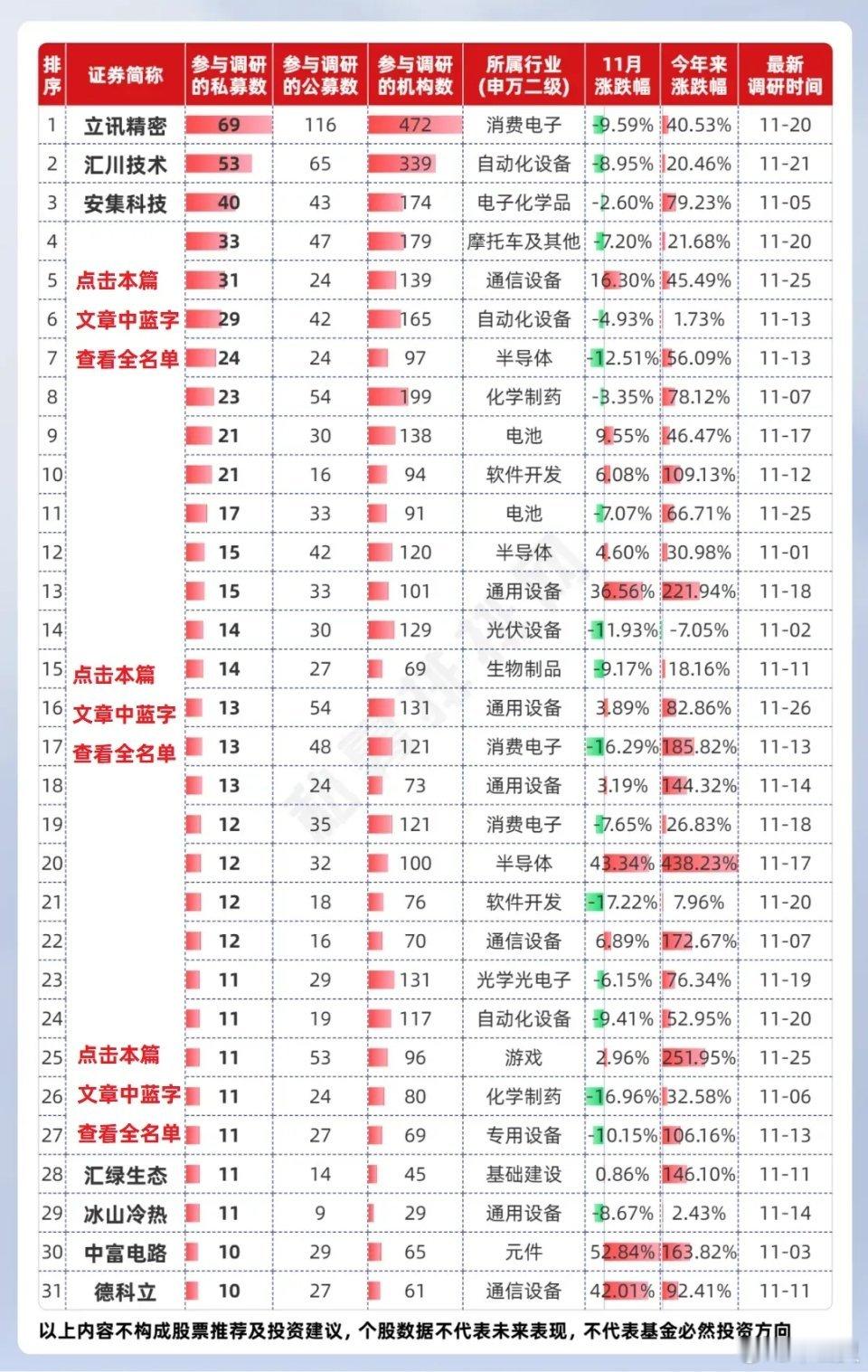 被10家以上私募调研的A股公司名单曝光!查看名单:私募11月扎堆调研31股!今年来业绩领先的远信、复胜调研这些_私募排排网笔者梳理出了11月份被10家以上私募调研过的A股公司,共有31家。其中10家公司均被20家以上私募调研过。11月份,私募调研最多的3家公司分别是立讯精密、汇川技术、安集科技。其中,截至11月27日收盘,谷歌TPU概念股中富电路在11月以超50%的涨幅领涨。11月3日,有10家私募调研了中富电路,包括百亿私募复胜资产。查看11月份被10家以上私募调研过的31家A股公司名单:私募11月扎堆调研31股!