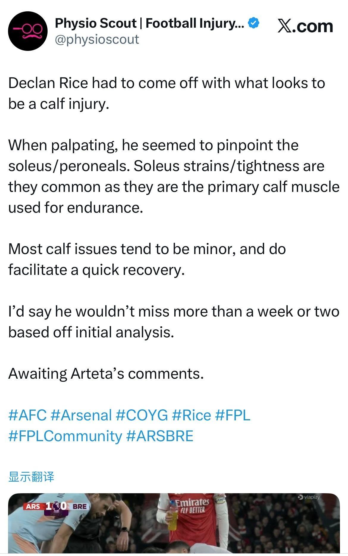 PSFI(球员伤病分析大神)关于阿森纳球员德克兰·赖斯的伤情分析:德克兰·赖斯因疑似小腿受伤不得不被换下。通过触诊,他似乎明确指出是比目鱼肌/腓骨肌群的位置。比目鱼肌拉伤/紧张很常见,因为它是用于耐力的主要小腿肌肉。大多数小腿问题往往是轻微的,并且确实有利于快速恢复。根据初步分析,我认为他的缺阵时间不会超过一至两周。等待阿尔特塔的回应。