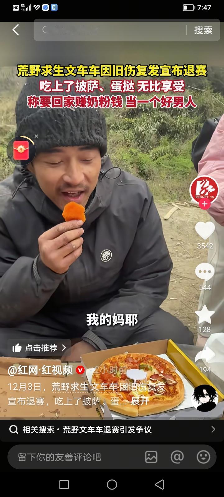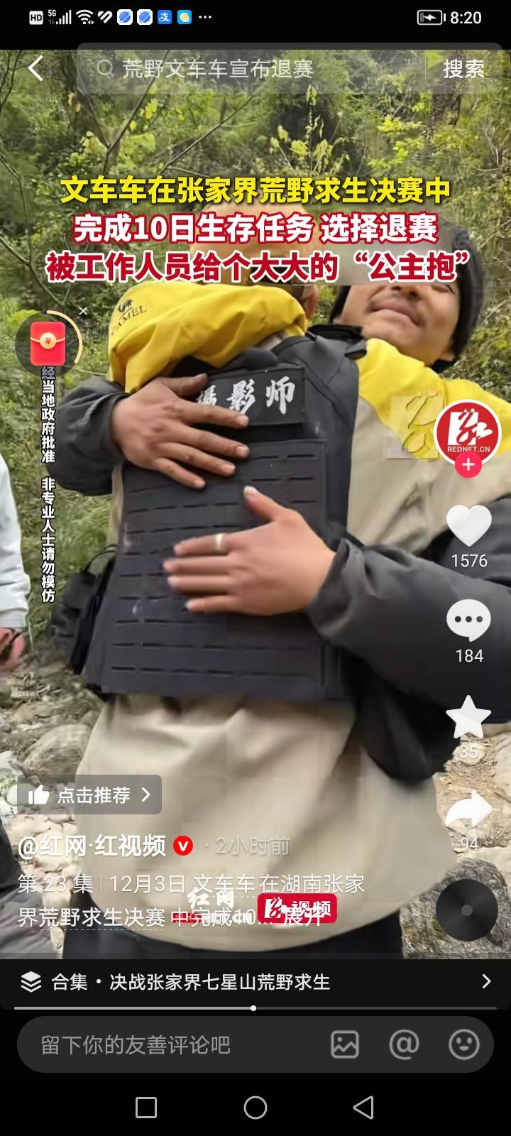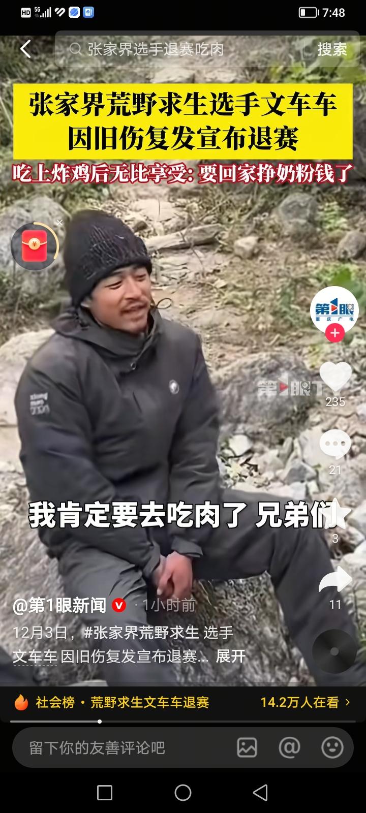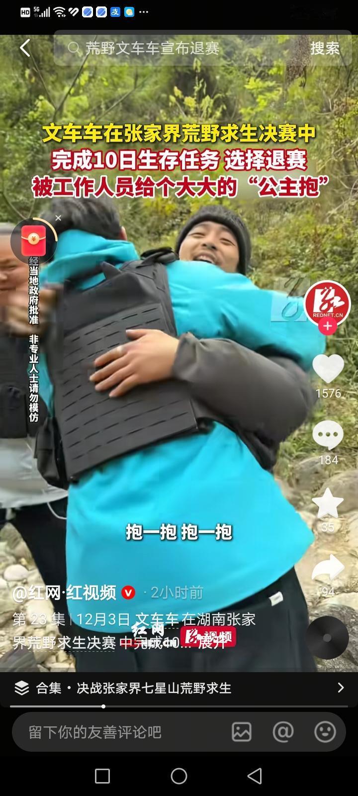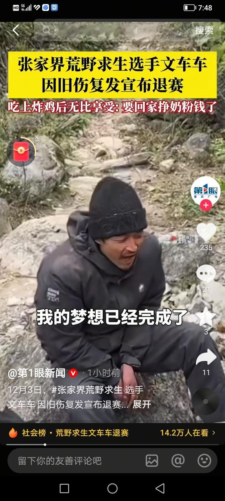 看到消息,七星山荒野求生文车车因伤势复发退赛了。文车车这次退赛的姿态特别圈好感,大气,体面,没有陷入网络上常见的口水战,也没有多余的炒作式发言,最后那番话反而满是真诚,既尊重了比赛,也尊重了自己和关注者,这种“不纠结、不撕扯”的体面,在当下的网络环境里确实难得。之前刷到他的视频不是很多,但今天的发言确实非常喜欢。作为一个北方汉子,南方的这种冬天会很不适应。我们南方人冬天就全靠硬撑,没有别的办法。他还能坚持这么多天,已经非常了不起了,从开赛到现在,他的表现都无可挑剔。最后的发言,在我看来,那真的是体现了智商,情商,口才三重方面的高度展现。 文车车:“我的梦想已经完成了,我非常的开心,肯定要去吃肉了。兄弟们,我要领取现金2000元。 我很开心,今天非常的高兴,等的这个时刻也日思夜想,因为已经把所有的梦想、目标全部完成。此时此刻,因为身体原因旧伤复发导致腹泻,身体已经到红线了,所以不得不去休养身体。因为还要挣钱养家,可可娃、可可美还等着我,要去挣奶粉钱了。 兄弟们,先把身体养好,安全第一,高兴第二,比赛第三,加油干吧,九九老钱精神永存。 谢谢所有的好朋友们。车车会记住你们每一个人,我爱你们。感谢七星山,感谢张家界,感谢所有老六荒野,感谢骆驼赞助,感谢我身边的每一位哥哥姐姐们,谢谢粉丝朋友们。 这次我这个西北汉子第一个来到南方大山,挑战51天圆满完成,这是我人生的最大的收获。”(图片信息来源:风芒新闻,红网—红视频)荒野求生 荒野求生比赛 张家界七星山骆驼杯荒野求生 宝鸡文车车 丛林荒野求生 文车车