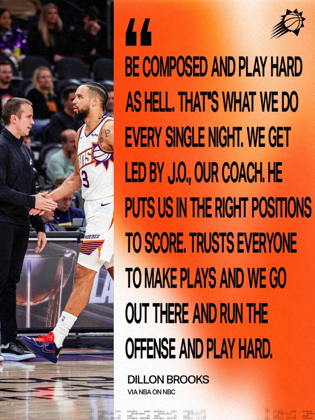 "沉着应对,全力以赴。这就是我们每晚的准则。我们追随J.O教练的指引,他为我们创造得分良机,信任每位队员的发挥。我们踏上球场,执行战术,拼尽全力。" 狄龙在媒体上说道。This is what we do. This is the Valley’s Spirit🏜菲尼克斯太阳旭日东升