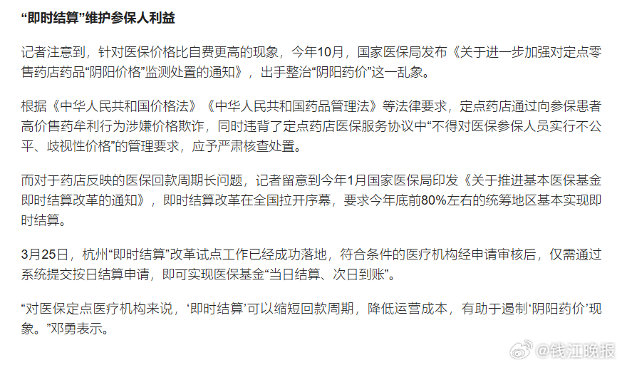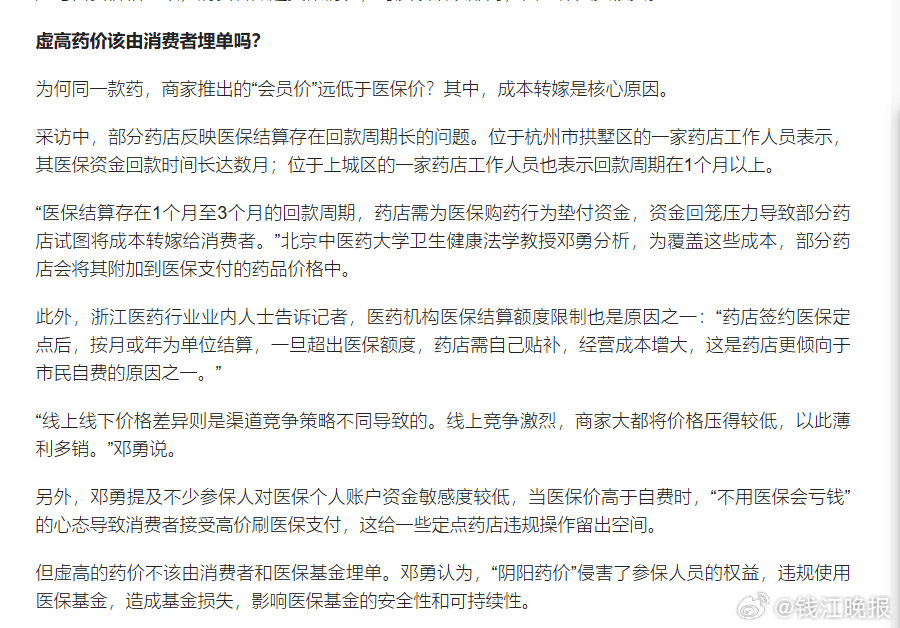 【#实体药店阴阳药价刷医保比自费贵#】近期,有杭州市民发现,部分药店以药品有“会员价”为由,告知市民自费比刷医保“更划算”。连日来,记者通过走访杭州多家医保定点药店发现,“阴阳价格”现象仍以隐性方式存在。在部分药店,同款药品医保结算费用高于自费,并且显著高于线上自费。在位于杭州市上城区清江路的康源药店,记者向店员咨询治疗神经性皮炎的药品,店员推荐了一款糠酸莫米松凝胶,售价58.2元,属于医保目录内药品。店员表示,该药如刷当年医保,仅需额外自行支付几元钱。当记者追问如不走医保、完全自费的价格时,店员称可以给“会员价”,打完折46元左右。药品“会员价”只针对自费支付,刷医保结算不可享受。这样,同一药品,用医保支付比线下自费支付多花费12.2元。同一药品价格的差异,不只存在于医保支付与自费之间。以记者购买的蒲地蓝消炎片为例,同一款药经不同门店和渠道,价格不同。在位于杭州市临平区的欣舟大药房(邱山大街店),该药线下标价28.5元,刷历年医保与自费支付同价。但该药店外卖平台页面显示有门店优惠活动,在不使用外卖平台优惠的情况下,线上仅需17.66元。(潮新闻 记者 廖君琳 陈雷 李攀)
