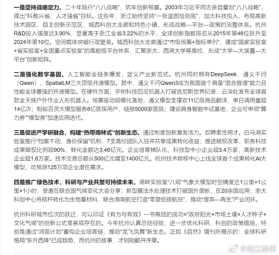 【#杭州首次跻身科研城市榜单全球前十#,周国辉:杭州正从“风景天堂”迈向“创新天堂”】近日,施普林格·自然在线发布了《自然》增刊“自然指数—科研城市”,中国首次占据全球科研城市十强榜单一半以上席位,由2023年的五席增至2024年的六席。其中,长三角地区表现尤为突出,上海、南京、杭州携手入围,成为榜单中的亮眼方阵。本次增刊聚焦2024年全球主要城市及都市圈在高质量期刊上的最新科研产出动态。在全球200座上榜城市中,中国占据43席。多座中国城市的表现有显著提升:广州从2023年的第八位升至第六,成功超越旧金山湾区;武汉稳步攀升一位,杭州则从2023年的第十三位跻身前十,实现历史性突破。(潮新闻 编辑 吴盈秋)
