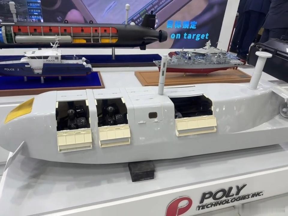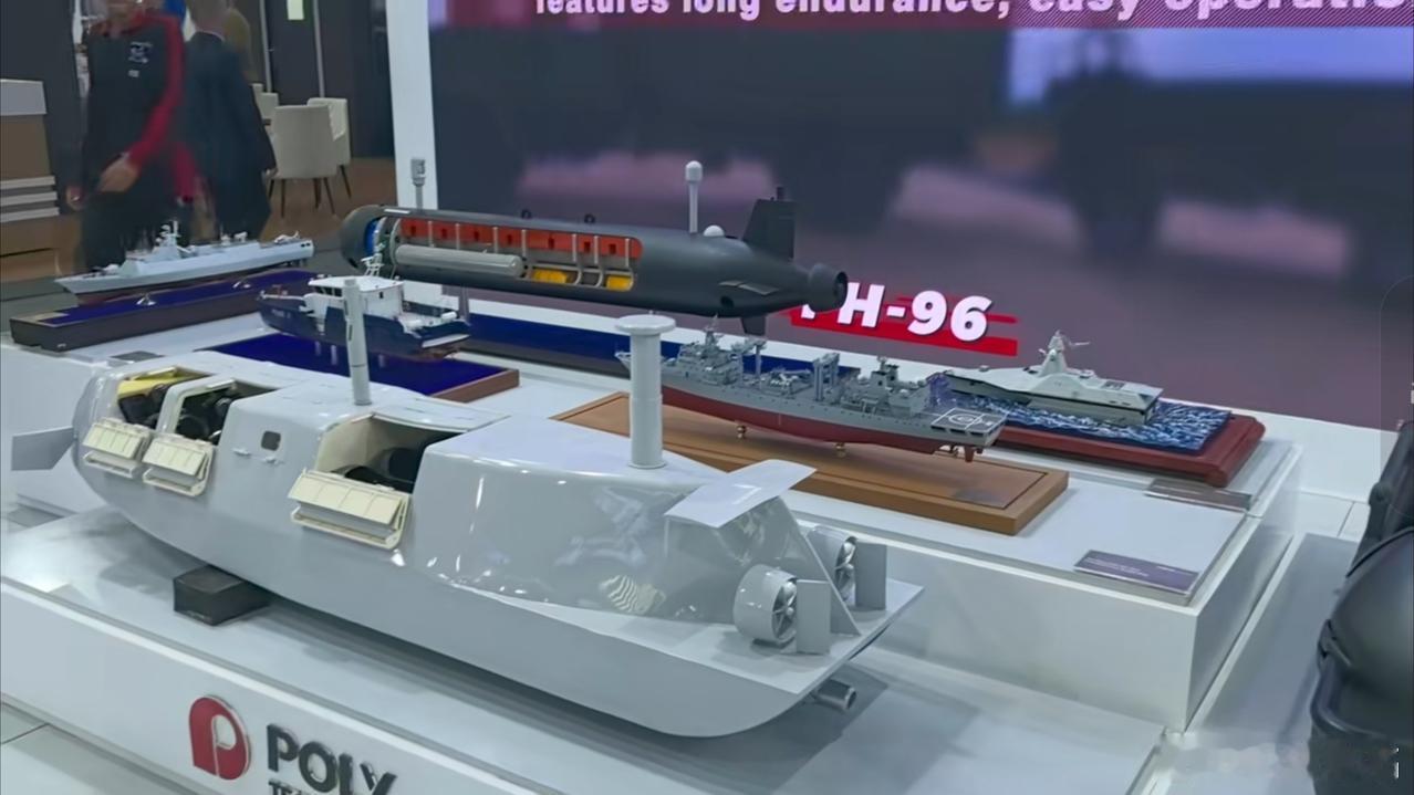 保利公司向海外推广的无人艇,设计非常独特,可以水面航行,也可以下潜到水面以下隐蔽航行,但是潜深有限。具体搭载的武器还不明确,可能包括水雷、无人机等。在埃及防务展上,保利公司推出一系列的无人舰艇,包括刚才的可潜艇,真正的无人潜航器,无人快艇等。我们下一步的目标,就是打掉昂撒军工复合体在第三世界国家的市场,斩断这些狗爪子。