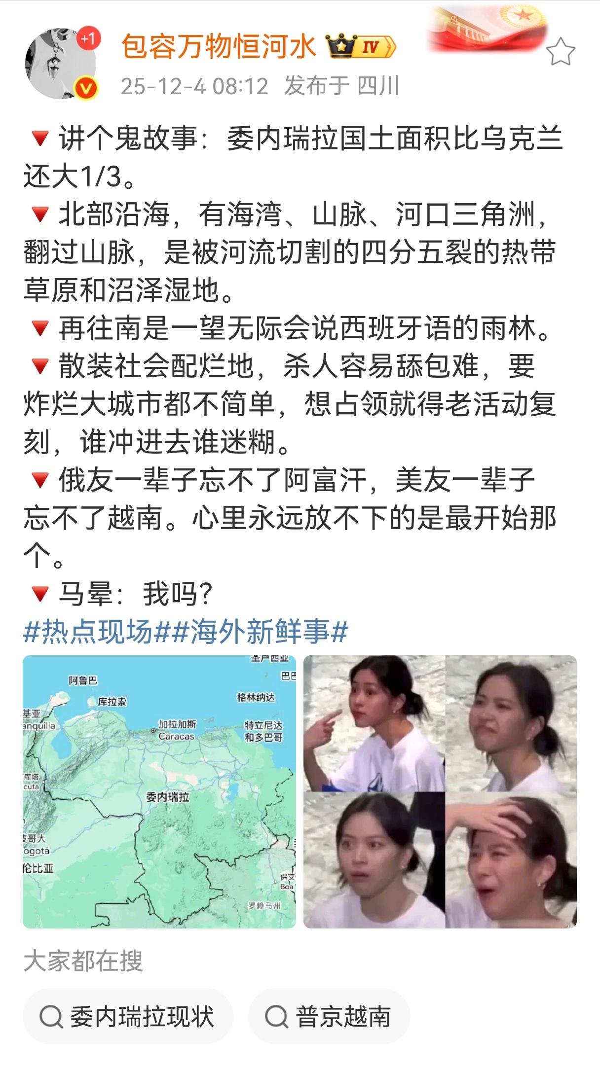 委内瑞拉这事儿,说到底就是“资源丰富是原罪”。这一定语的语境是基于“自由贸易”。但“自由贸易”有两重含义:一是穷国、弱国不打开大门就不是自由贸易,就是保护主义;二是如果穷国、弱国在高附加值的产业上领先了强国,强国对你加征关税不叫保护主义,叫基于国家安全。说来说去,穷国、弱国没有“国家安全”这一说法。这一理论只有一种情况可以破局,那就是穷国、弱国的国民有坚定的民族精神,愿意从一穷二白干起来,只要有钢铁意志,以小胜大的案例在历史上很多。
