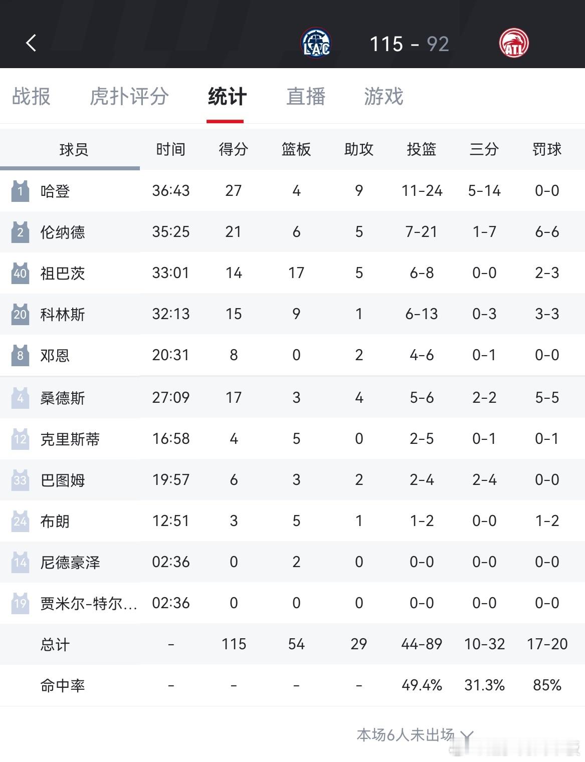 快船客场115-92大胜老鹰,结束五连败!哈登27分9助,伦纳德21分,科林斯15分,祖巴茨14分17板快船vs老鹰